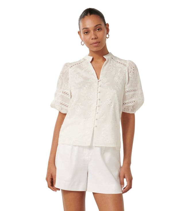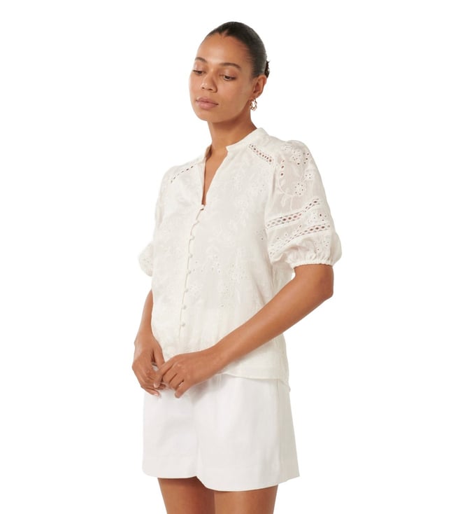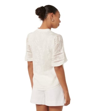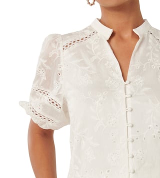 Get the perfect finish to your laid-back looks with this white top from Forever New. Tailored in regular fit, this top is light in weight and crafted from high quality fabric which will keep you at ease all day long. Featuring a mandarin collar, half sleeves and self design pattern, this top possesses a stylish allure. Complement this top by teaming it with a pair of jeans and sandals.