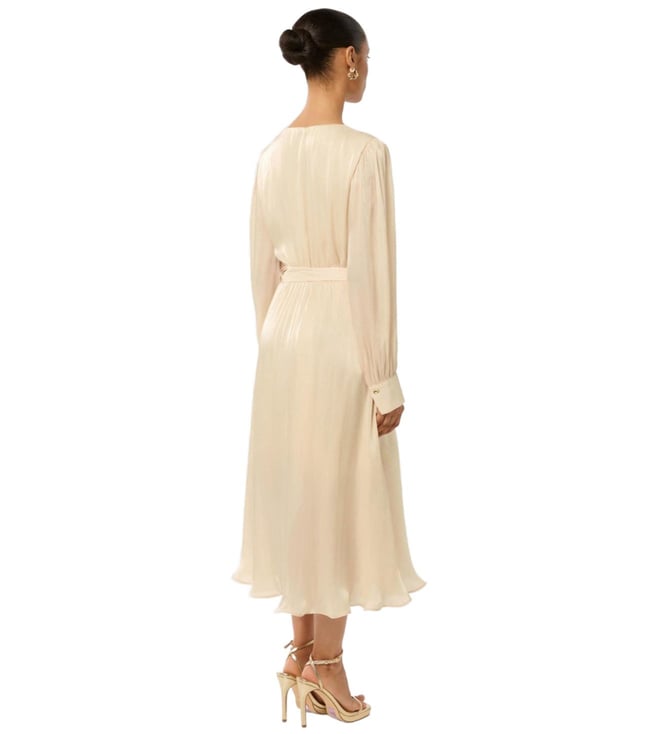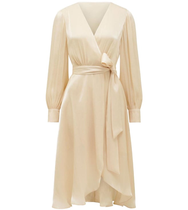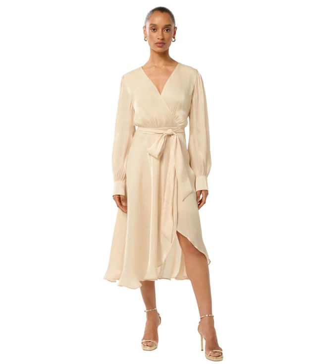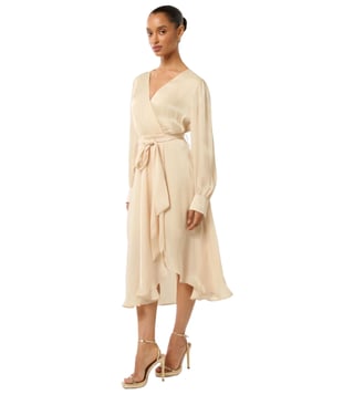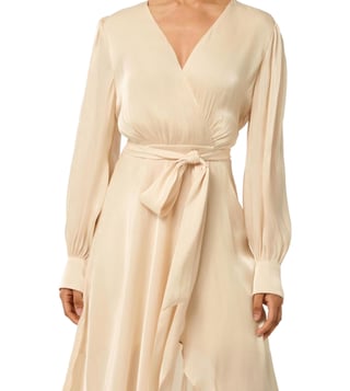 Elevate your casual wear with the Mabel Petite Metallic Wrap Midi Dress from Forever New. This gold, full-sleeve dress in polyester is perfect for chic, effortless style. Disclaimer: All other items in the image are only for display purposes and will not be a part of the delivery content. Product colour may slightly vary due to photographic lighting sources. Country of Origin - India.