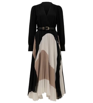 A vibrant symphony of color, this midi dress is a statement piece. Crafted from smooth polyester, it features a bold color-block pattern that pops against the backdrop of a classic V-neck and full sleeves. The regular fit ensures a flattering silhouette, while a chic belt cinches the waist for a touch of definition. Perfect for a day out with friends or a stylish evening event, this dress is sure to turn heads wherever you go.