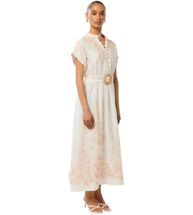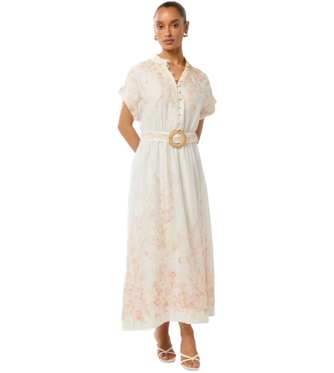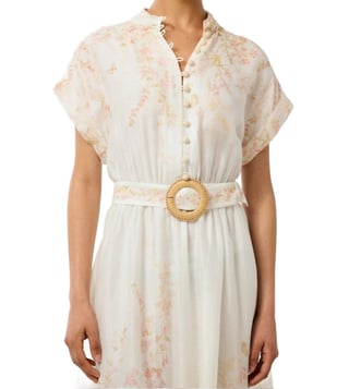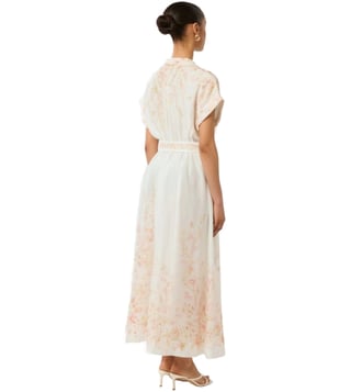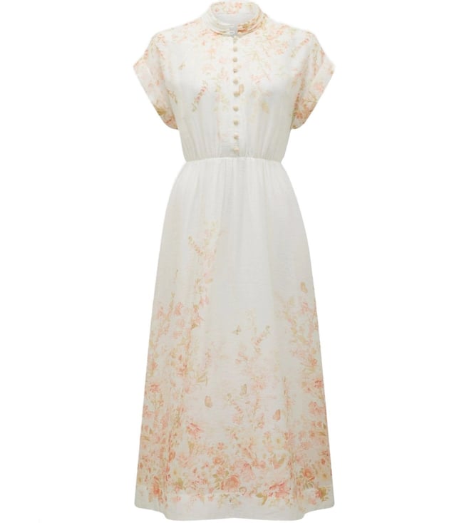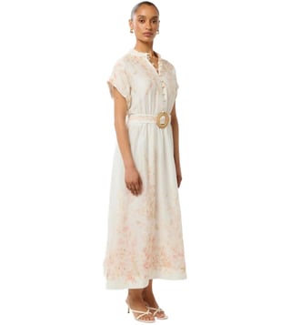 Take a fashion-forward stance by wearing this coral oxley regular fit dress from Forever New. Tailored to sartorial perfection from premium quality fabric, it assures a soft and soothing touch against the skin. The mandarin collar augments its design. Exuding short sleeves, it is sure to fetch you compliments from all. The floral print makes it a bewitching choice.