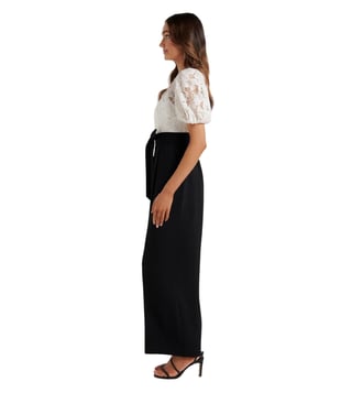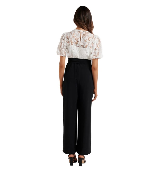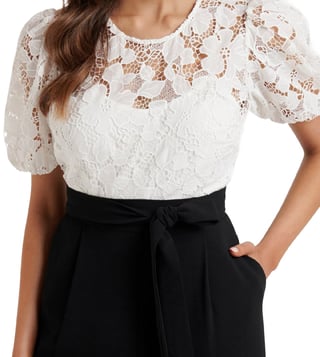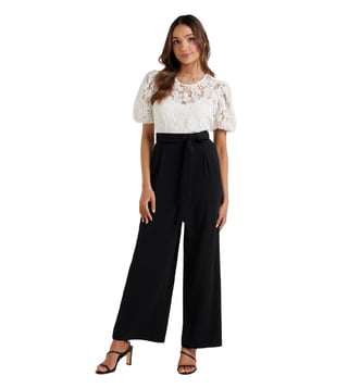Let your carefree, stylish side be expressed to the world with this fine white & black jumpsuit from the latest collection of Forever New. Beautifully crafted in premium polyester for gentle lustre and a feather-like, smooth softness complemented by superb drape and comfort, it's chic lace pattern makes it stand apart. Pair it with matching heels for a stunning look.