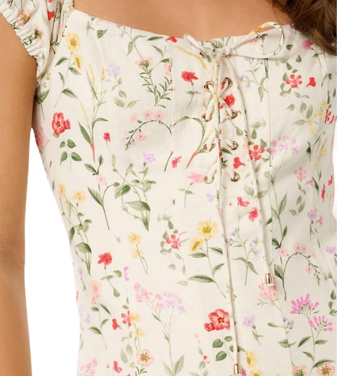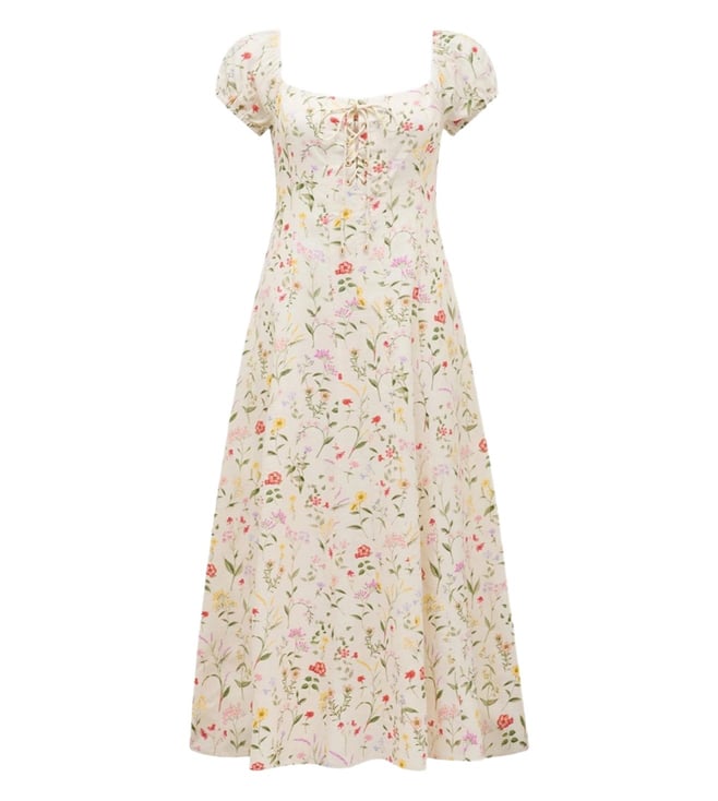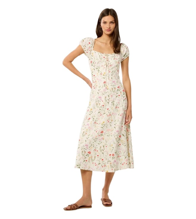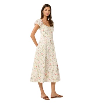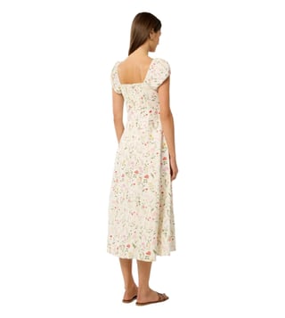 Experience effortless elegance with the Forever New off white sallie tie floral regular fit midi dress. Crafted from premium viscose, this dress features a regular fit that flatters every silhouette. The short sleeves and scoop neck lend a refined, feminine charm. In a captivating off white hue with a floral pattern, it's the perfect choice for casual wear. The midi length adds a touch of drama to every step.