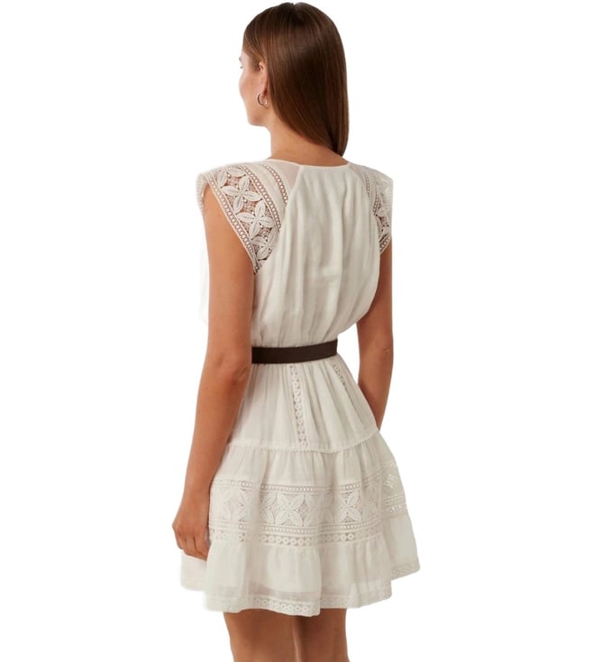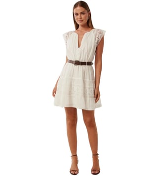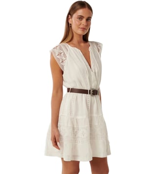 Make a head-turning statement by wearing this porcelain regular fit dress from Forever New. Tailored to sartorial perfection from premium quality fabric, it assures a soft and soothing touch against the skin. The round neck adds to its appeal. The lace pattern lends it a finial touch.