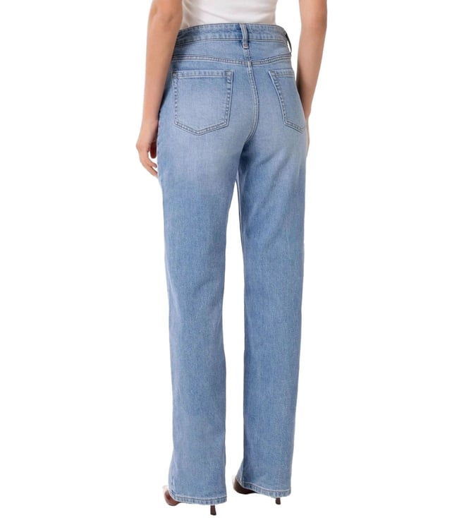 Take a fashion-forward stance by wearing this pair of light wash straight fit jeans from Forever New. Tailored to sartorial perfection from premium quality fabric, it assures a soft and soothing touch against the skin.