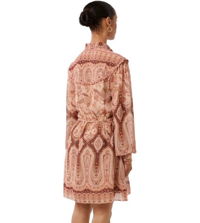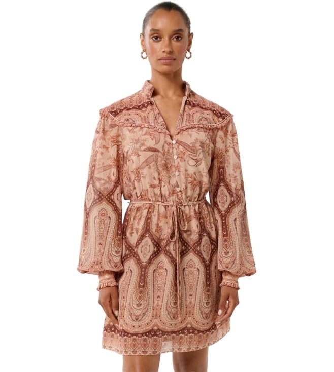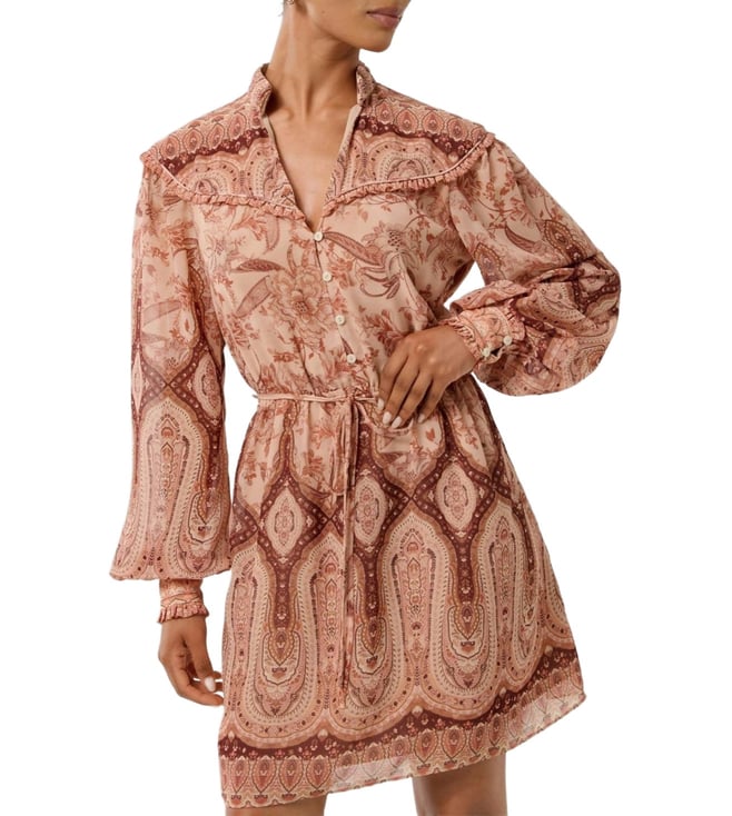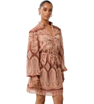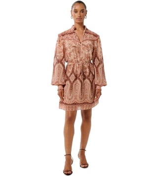 Magnify your wardrobe with this peach moss floral regular fit dress from Forever New. Tailored to sartorial perfection from premium quality fabric, it assures a soft and soothing touch against the skin. The band neck adds to its appeal. Exuding full sleeves, it is sure to fetch you compliments from all. The printed pattern makes it a captivating choice.