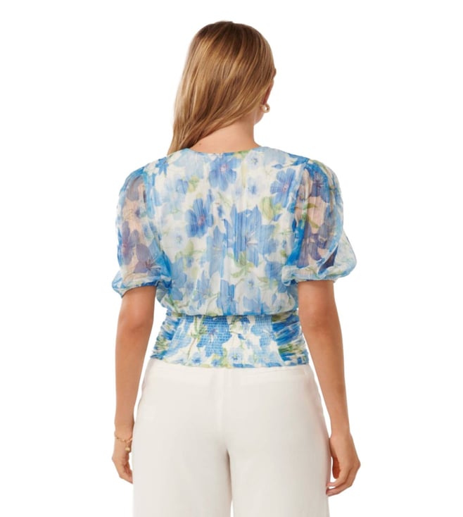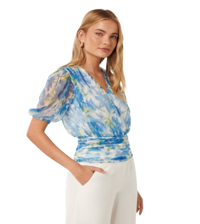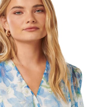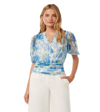 Give your casual wardrobe a stylish lift with this blue and white top from Forever New. Fashioned using high quality, this regular fit top will not fail to catch your fancy at a single glance. Featuring a v neck, half sleeves and floral print pattern, this top holds an elegant appeal. Team this top with a pair of distressed jeans and matching strappy sandals for a cool casual look.