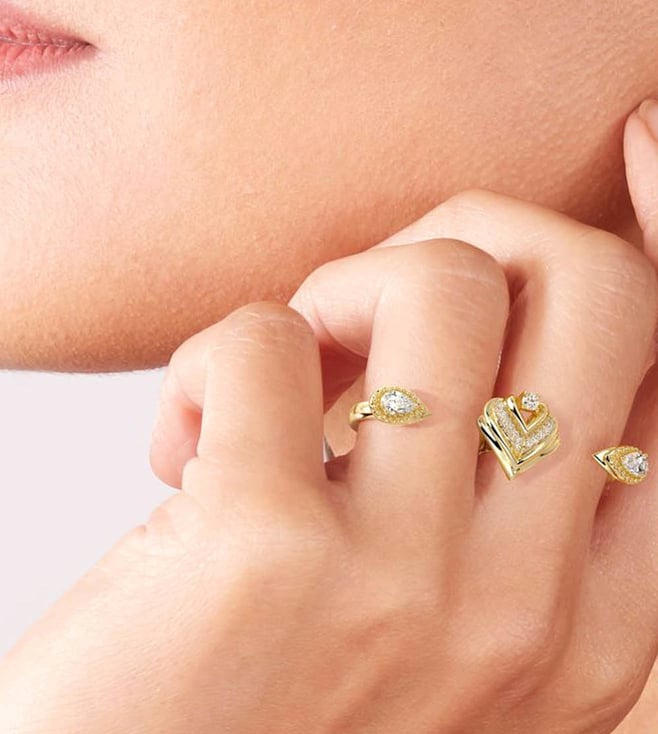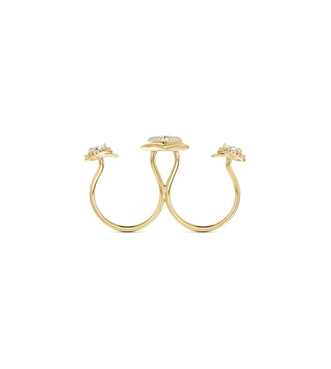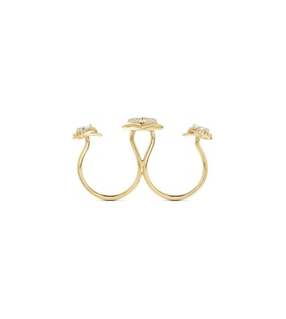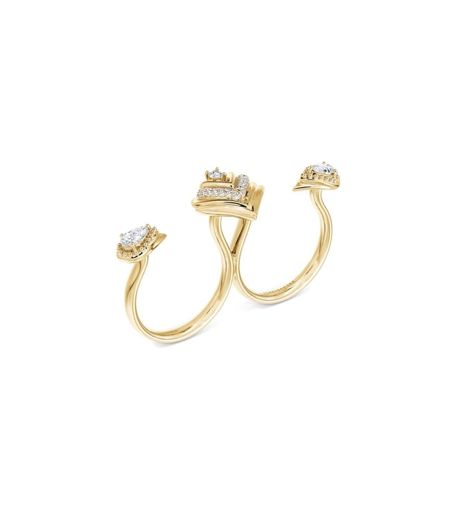 Not a ring. A statement. This version of the Double Finger Ring features two bold arcs of gold running parallel across the hand, connected by a delicate pave bridge of 45 shimmering diamonds, accentuating the centerpiece of two stunning, brilliant Forevermark diamonds. The tension between the structure and sparkle is what makes it feel modern clean lines, with surprising softness. This Double Finger Ring with pear-shaped diamonds is designed to shift with your gestures, resting easily yet feeling unmistakably present.