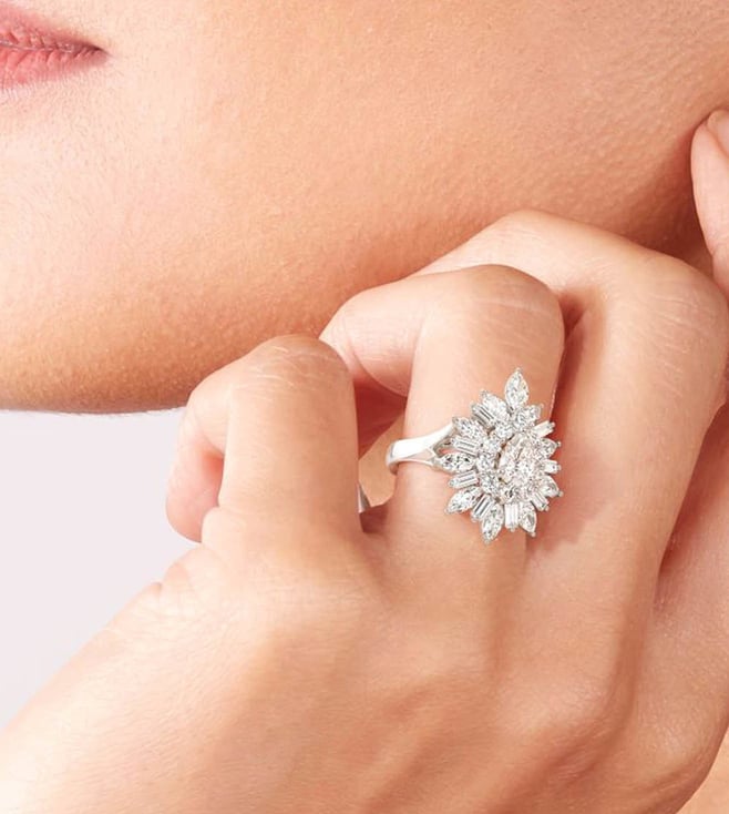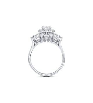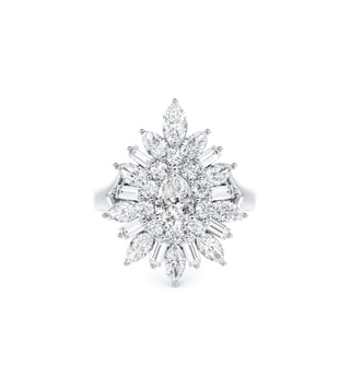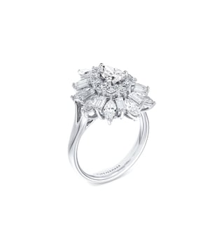 The Celestial Bloom Pear Halo Cocktail Ring is an invitation to bold self-expression. At its centre, a commanding pear shaped diamond is encircled by a radiant burst of baguette shaped diamonds - each facet cut to catch light and attention from every direction. The design draws from classical grandeur while embracing a sculptural modernity. Its unique silhouette resembles a crown in bloom - brilliant, uncompromising, and designed for those who lead with presence. Every detail is honed to elevate the central stone, allowing its clarity and fire to shine with effortless distinction.