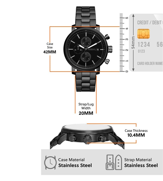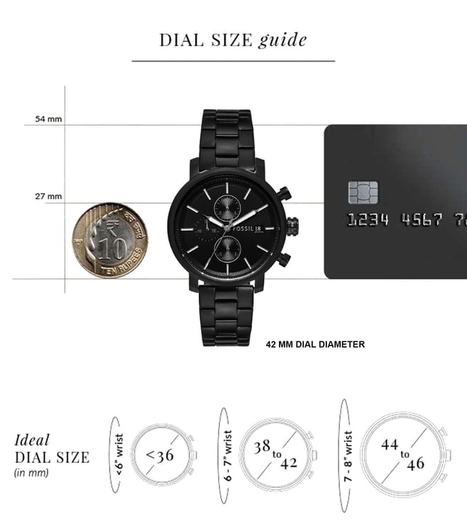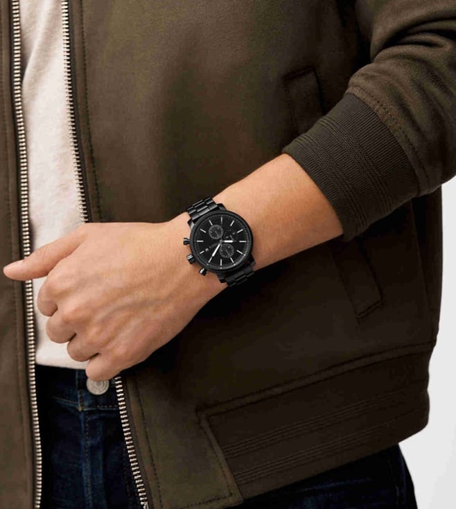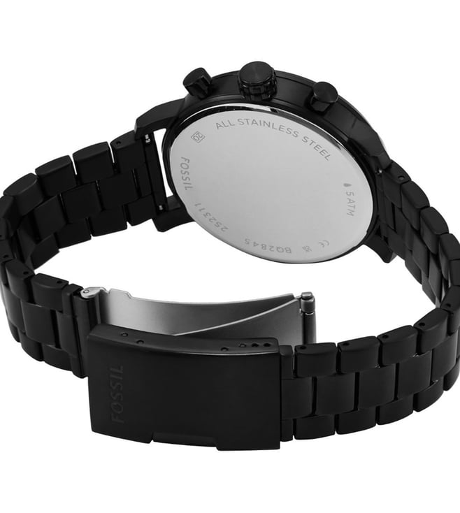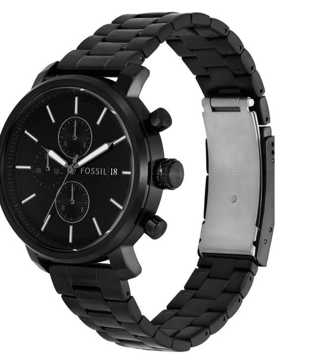 Add a stylish dimension to your look by wearing this men's analog watch from the collection by Fossil. The black round dial is protected by a mineral glass. It features a crown for time adjustment. The stainless steel strap comes in a black hue that further elevates the look of the timekeeper. Besides, it is completed with a buckle clasp to ensure a secure fit on the wrist.