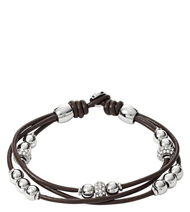 Wrap your wrist in multiple layers of leather bracelet from the house of Fossil which will contour your wrist fully. Crafted in glistening rondel beads benefit from an accent of classically brown on this luxe leather slider. This slider bracelet strands intertwined for a carefree and stylish appearance. This Fossil Bracelet is the perfect everyday accessory for any occasion.