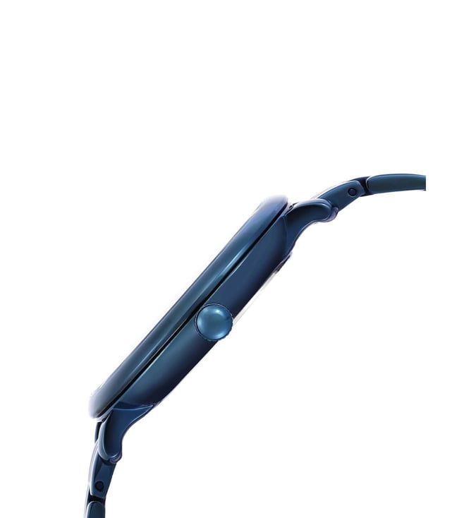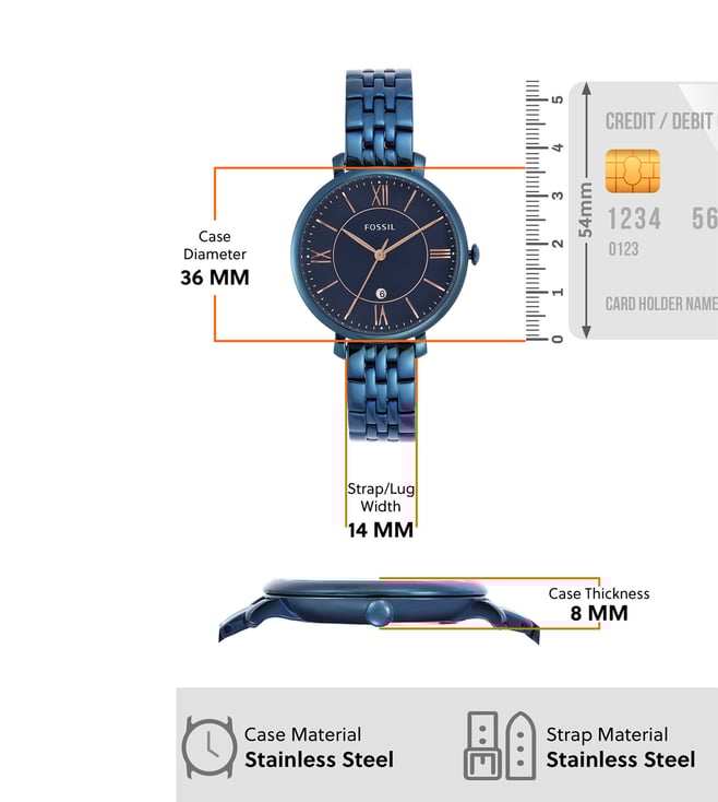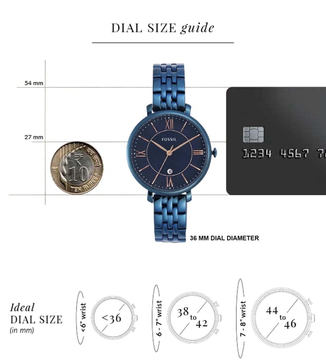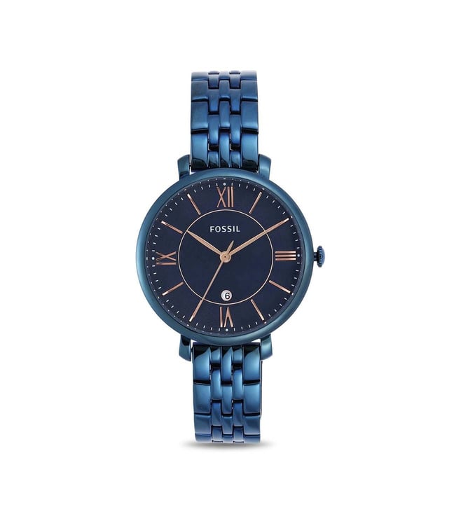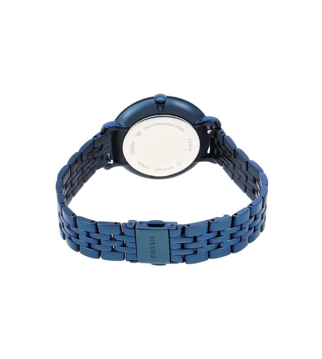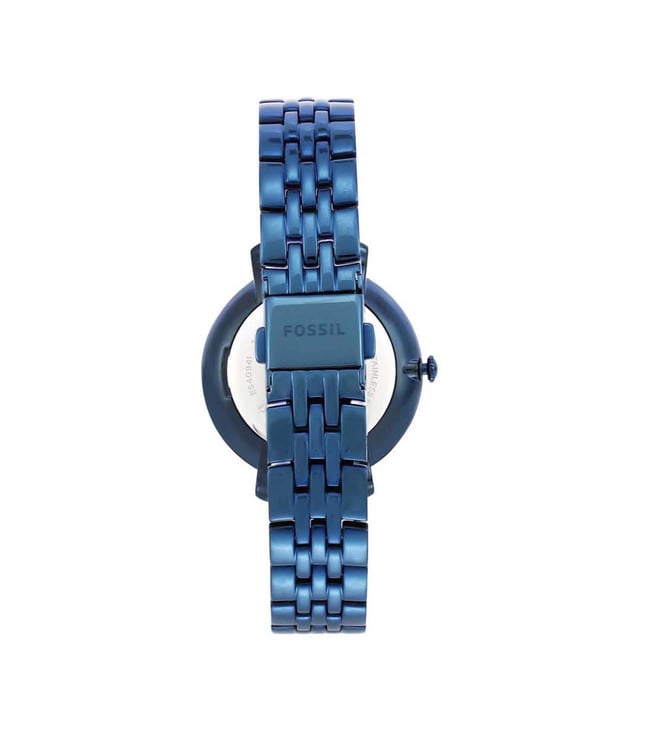 Own this women's analog watch from the Jacqueline collection by Fossil and keep yourself updated with the latest trends. Its stainless steel strap flaunts a blue hue that accentuates the look of the watch. The navy round dial is protected by a mineral glass and is nestled in a 36 mm case. It showcases plain three hands and a crown for time adjustment. Furthermore, it is complemented with a push-button clasp that ensures a secure fit on the wrist.