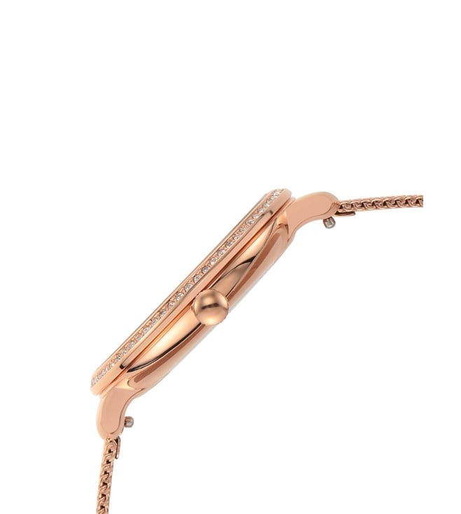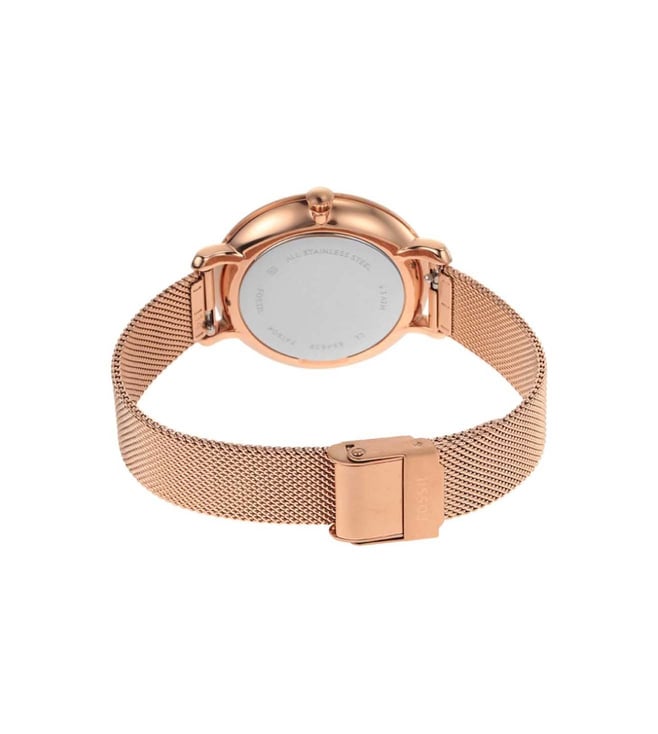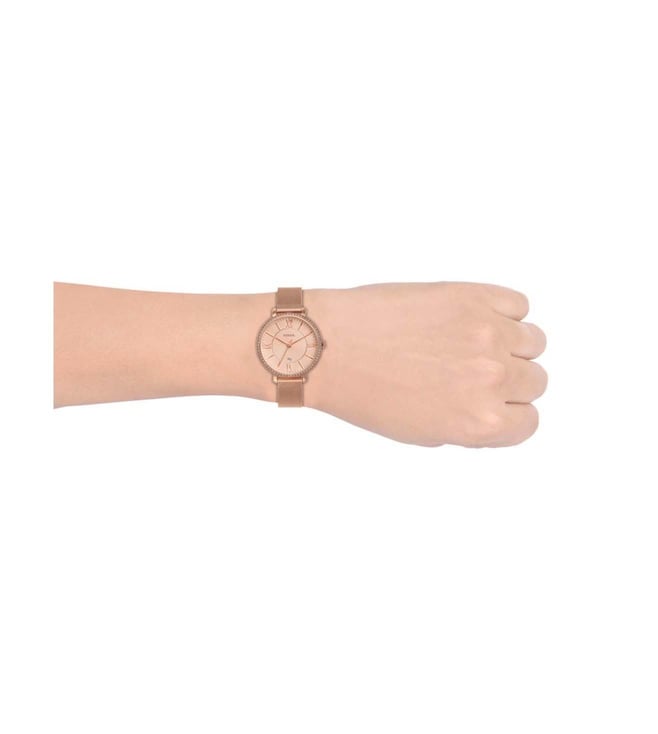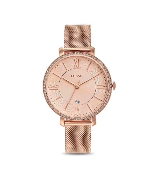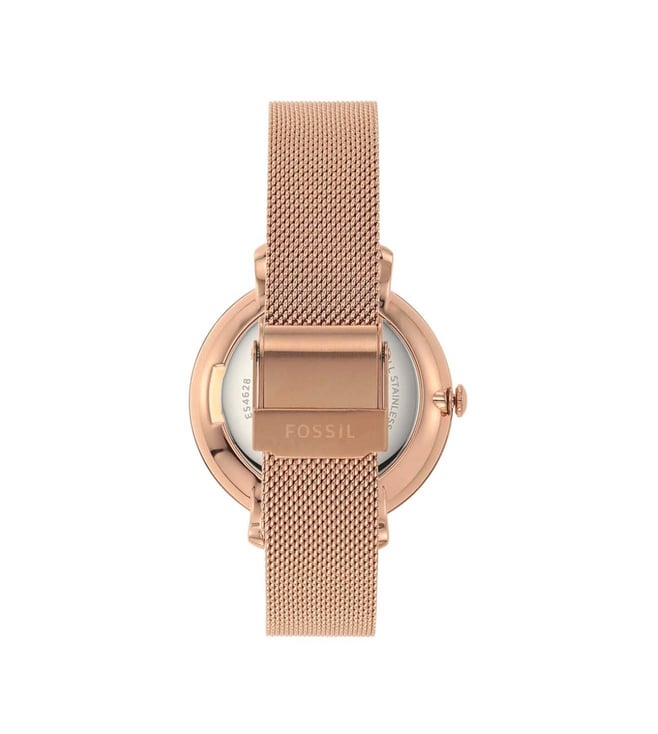 Style arrives effortlessly the moment you wear this smartly designed women's analog watch from the Jacqueline collection by Fossil. Protected by a mineral glass, the rose gold round dial is nestled in a 36 mm case. It vaunts plain three hands and a crown for time adjustment. The stainless steel strap comes in a rose gold hue that further elevates the look of the watch. Moreover, it is fitted with a hook buckle clasp that ensures a secure fit on the wrist.