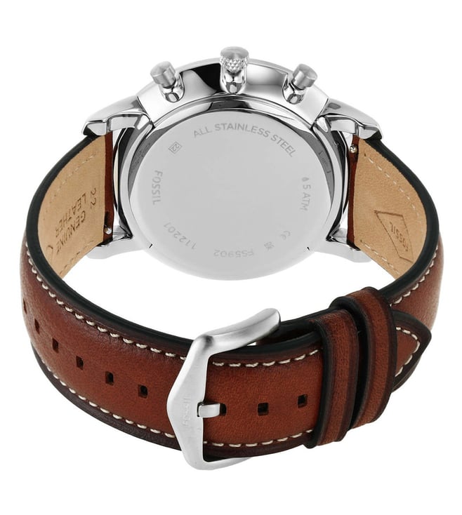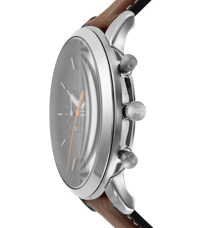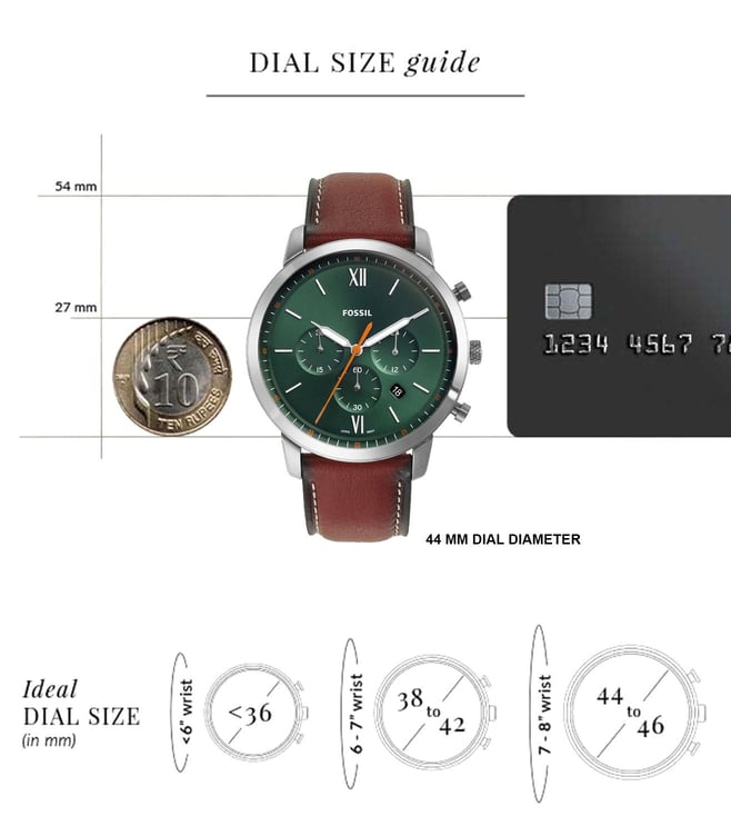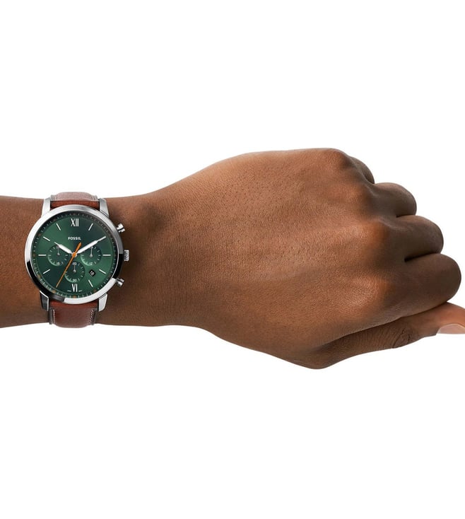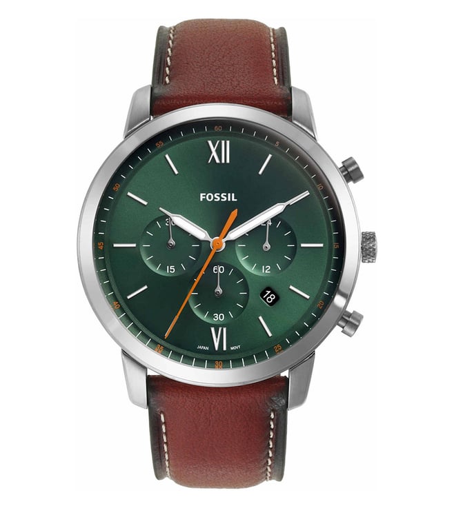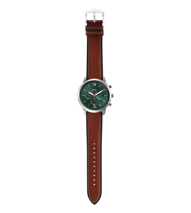 Lending a contemporary twist to an elegant design, this men's analog watch from Fossil is a must-have wrist essential. This 44mm Neutra Minimalist features a green sunray dial, chronograph movement and brown leather strap. The green round dial is secured by a mineral glass and is housed in a case. Furthermore, it is completed with a buckle clasp to ensure a secure fit on the wrist.
