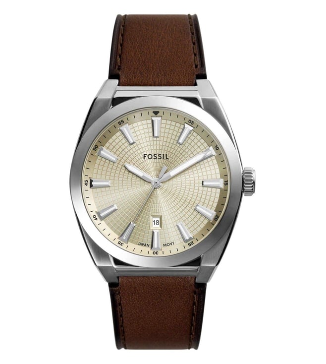 This 42mm Everett watch features a cream sunray dial with a three-hand date movement and a classic brown leather strap. Its elegant design combines functionality with a sophisticated, timeless look.