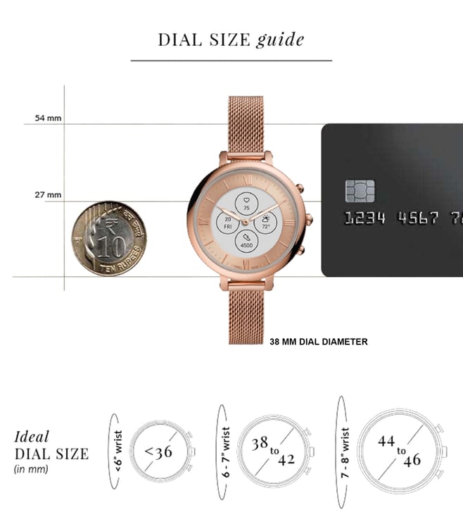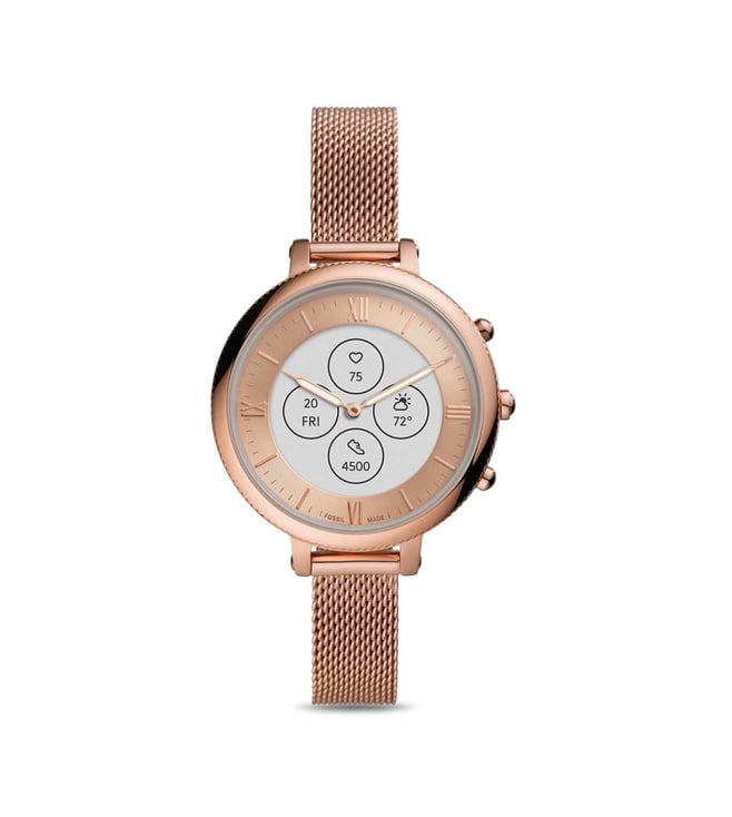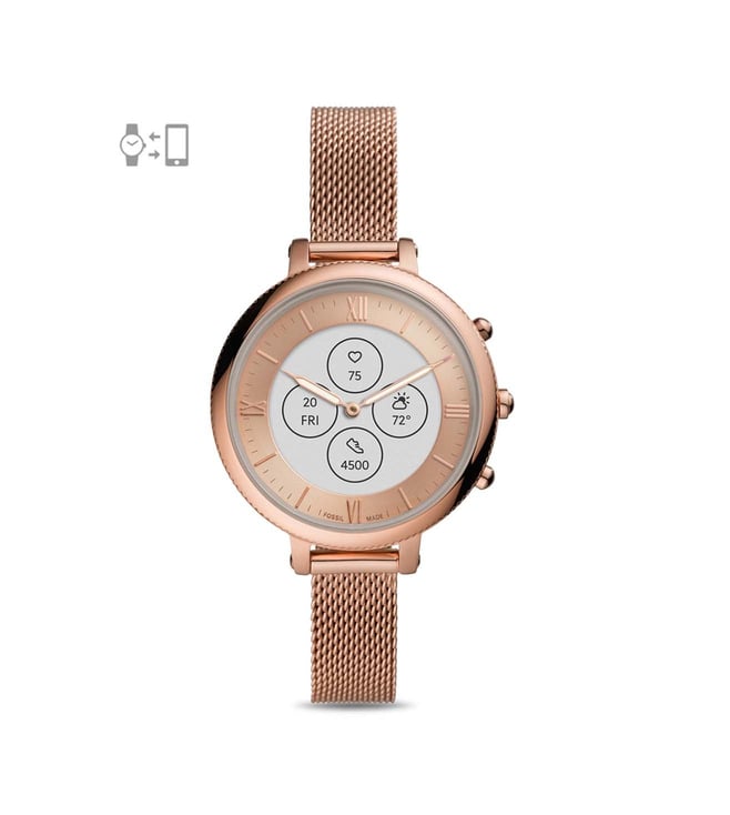 Turn heads at the office or wherever you go with the Fossil smartwatch. Where smart meets style, this 38mm Monroe Hybrid smartwatch features a rose gold-tone stainless steel mesh bracelet and an always-on readout display so you can get your heart rate, message previews, weather and more at a glance, with up to 2 weeks of battery life on a single charge. The Bluetooth enabled watch is compatible with Android OS 5.0 plus, iPhone 5 or iOS 12.0 plus. This timepiece can be interchanged with all 12mm straps to customize your look and also elevates your attire.