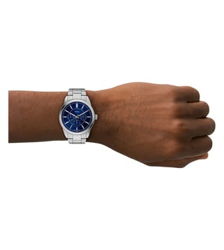 A stainless steel bracelet and matching case create a sleek foundation for this watch's design. The blue sunray dial adds texture and depth, complemented by practical sub-dials for day, date, and 24-hour functionality. Thoughtfully constructed with polished materials and a versatile round case, this piece balances refined details with everyday practicality.