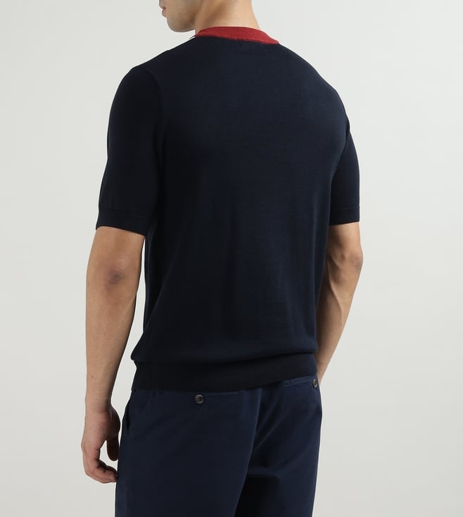 Embrace timeless pattern play with this navy vertical stripe knitted t-shirt, offering nautical-inspired style. The vertical stripes create a lengthening effect, adding interest to your casual wardrobe without overwhelming your appearance. Made from pure cotton knit for comfort and natural stretch, it combines the ease of a t-shirt with refined knitwear. The navy base provides a sophisticated foundation for the striking stripe pattern, ensuring versatile styling options. The knitted construction offers superior drape and movement, creating an elevated casual option.