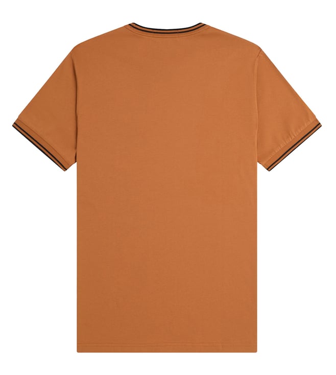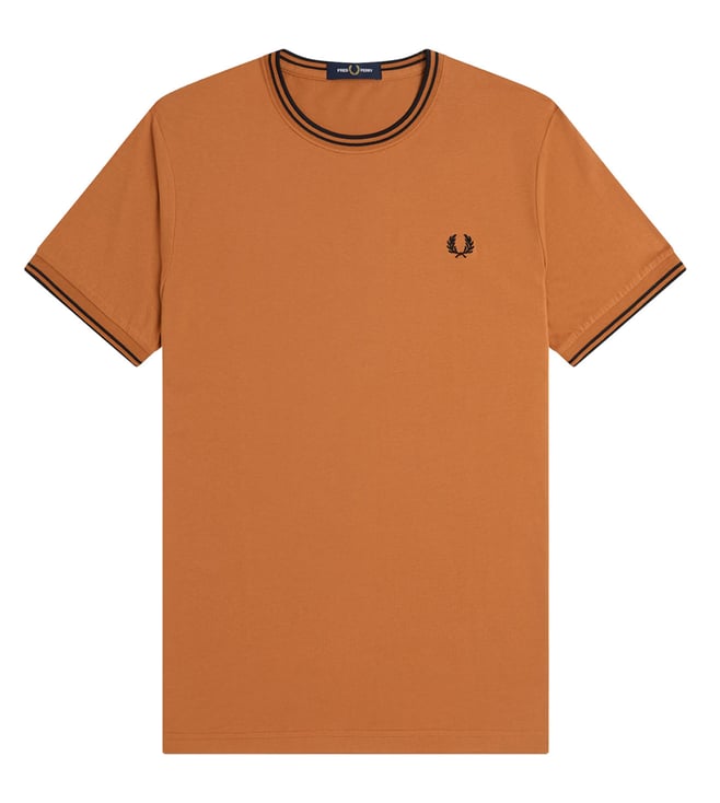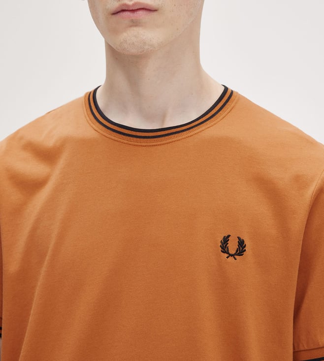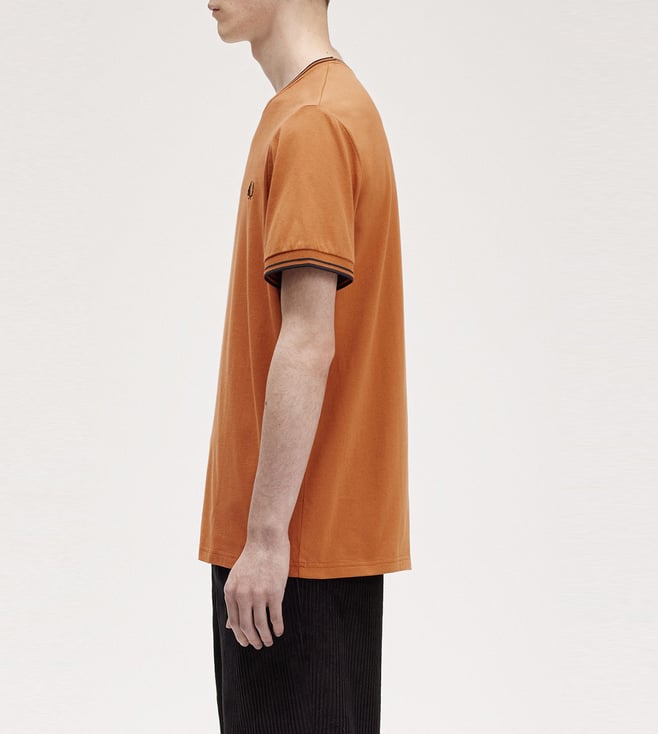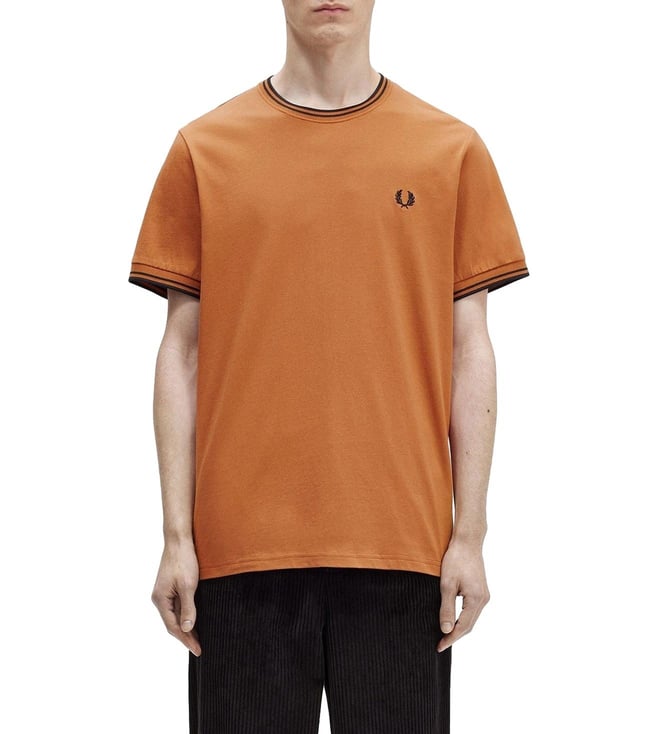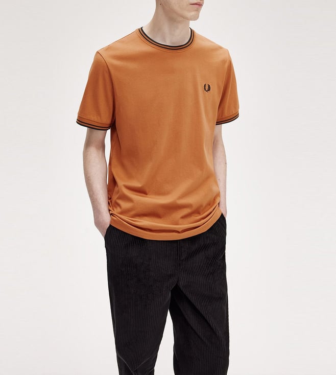A brilliant melding of style and comfort, this orange regular fit t-shirt from Fred Perry will be a smart addition to your wardrobe. Tailored to sartorial perfection from premium quality fabric, it assures a soft and soothing touch against the skin. The crew neck adds to its appeal. Exuding short sleeves, it is sure to fetch you compliments from all.