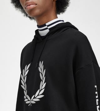 Fred Perry's black hooded sweatshirt is the epitome of modern casual style. It features a large graphic Laurel wreath on the front and bold branding on the left sleeve for a signature touch. With drop shoulders for a relaxed fit and an elasticated hem for added comfort, this cotton-made sweatshirt is both comfortable and fashionable. Style it with joggers and sneakers for an impressive cool, casual outfit. Fred Perry's enduring legacy is a testament to its impeccably designed clothing.