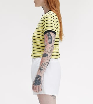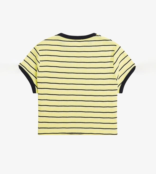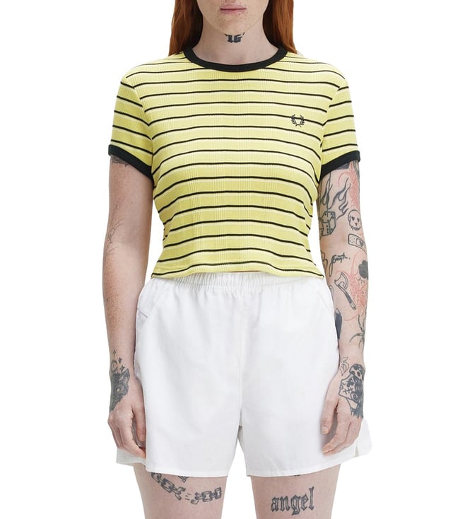 Radiate sunshine and style with this vibrant yellow T-shirt, designed for the modern woman who values comfort and flair. Featuring a classic round neck and short sleeves, this regular-fit tee boasts a chic striped pattern that adds a playful touch to any ensemble. Crafted from a soft blend of 60% cotton and 40% polyester, it offers breathability and durability for everyday wear. The subtle closure detail enhances its sleek silhouette, making it a versatile staple for both casual outings and relaxed gatherings.