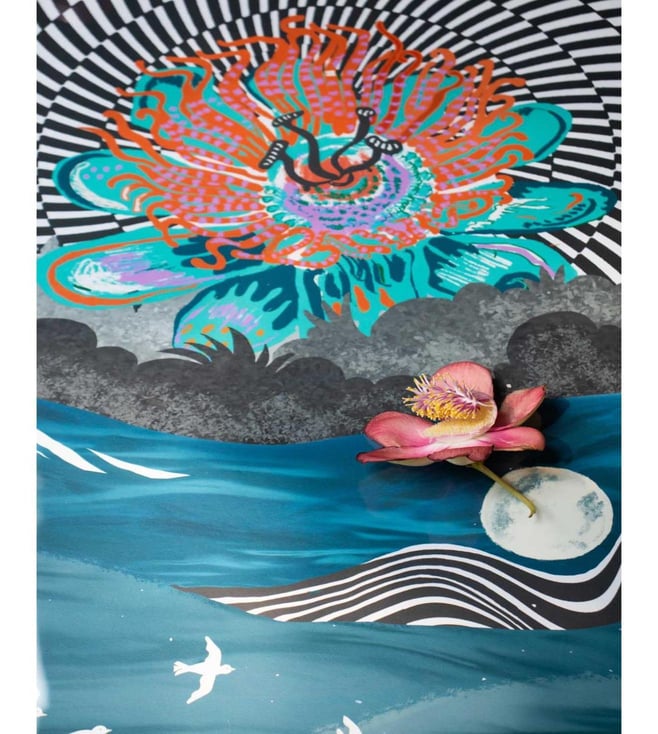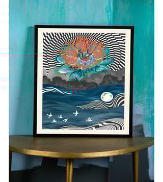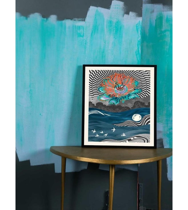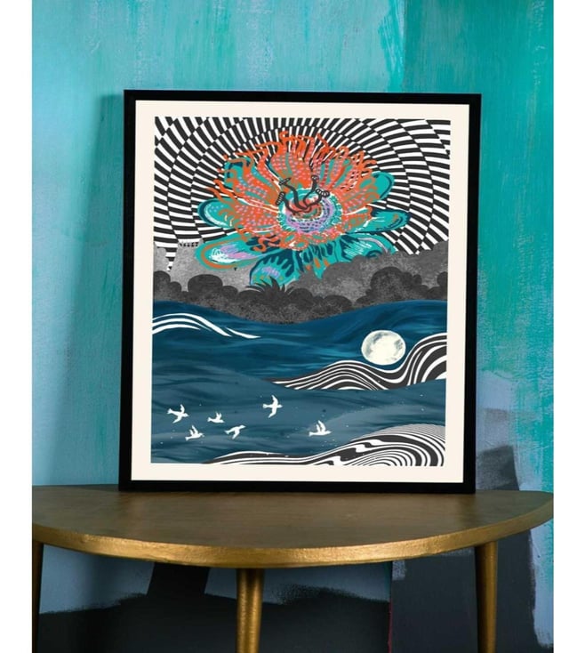The Passiflora Illusion is a surreal rendition of an orange and teal Passiflora bloom rising over the horizon, overlooking a landscape of black and white stripes and waves of blue. Inspired by the psychedelic art movement of the 50¿s, the design is encased in a modern black frame and glass front for protection. It¿s perfect for creating a bold focal point in the living room, in a study for artistic inspiration, or in the bedroom as an escape to a world of imagination.