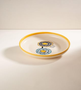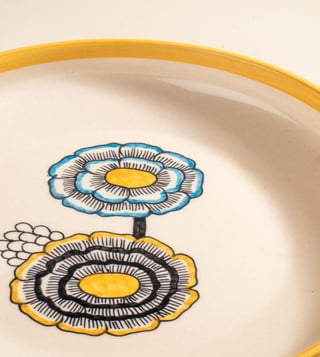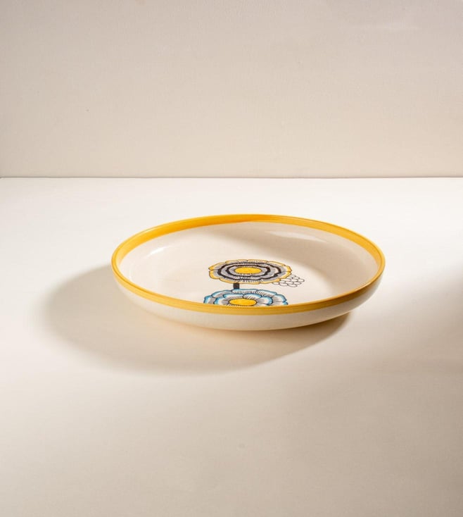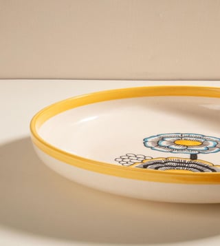 With its hand-glazed mustard yellow finish and handpainted motifs of the Tuluka bloom, the Tulukka Pasta Bowl brings in a cheery palette to the dining table. Crafted in ceramic, it¿s ideal for serving pastas, salads, or one-bowl meals. Works as a generous individual portion plate or as a serving bowl.