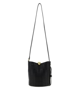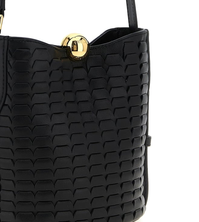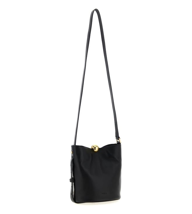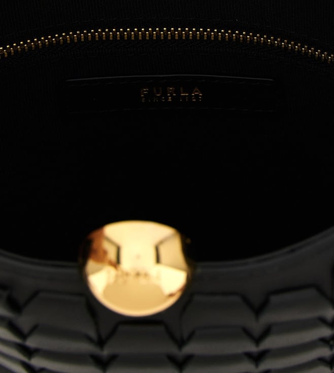 Expand the collection of your accessories in a trendy way with this bag from Furla. Black furla sfera soft mini leather bucket bag with braided front, magnetic closure with ball hardware, back embossed logo, adjustable shoulder strap.
