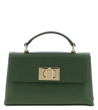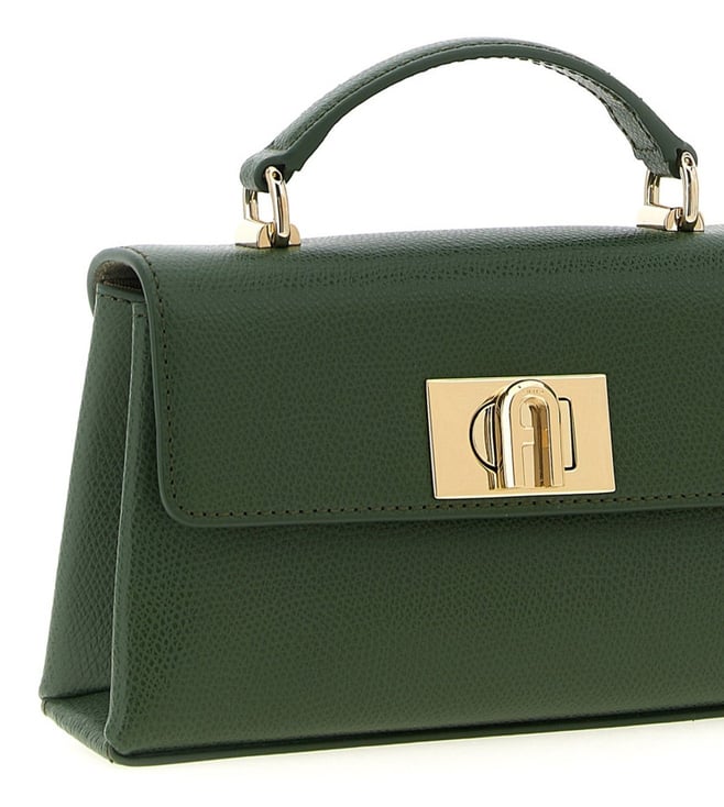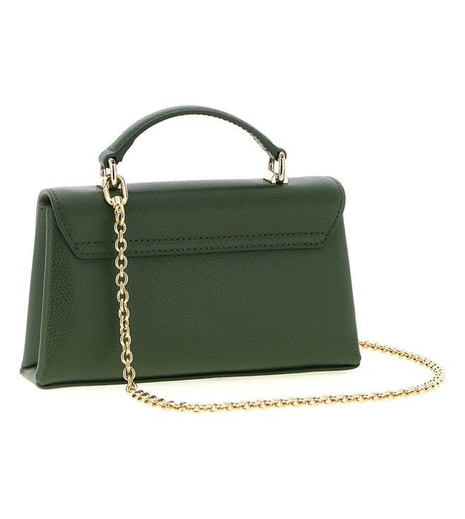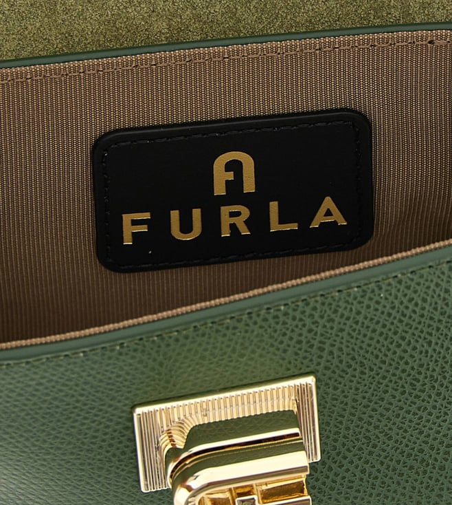 Expand the collection of your accessories in a trendy way with this bag from Furla. Green furla 1927 mini crossbody bag in fine printed leather with a garnet texture, flap closure with metal spin with arco logo, fixed handle, removable chain shoulder strap.