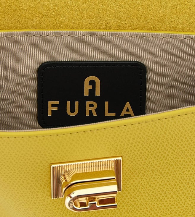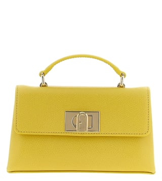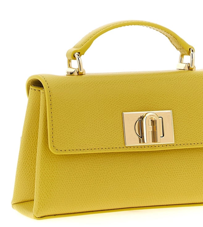 Expand the collection of your accessories in a trendy way with this bag from Furla. Yellow furla 1927 mini crossbody bag in fine printed leather with a garnet texture, flap closure with metal spin with arco logo, fixed handle, removable chain shoulder strap.