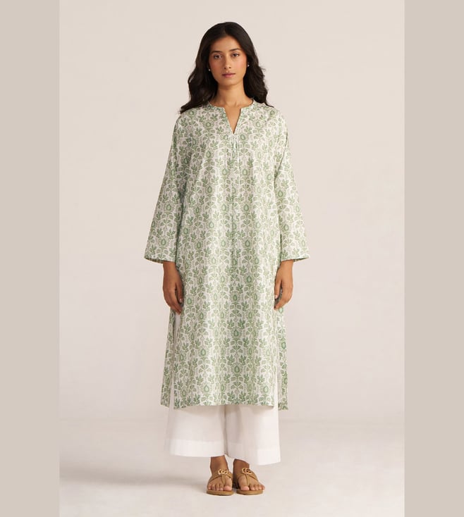 Light Grass Green And White Cotton Regular Fit Kurta