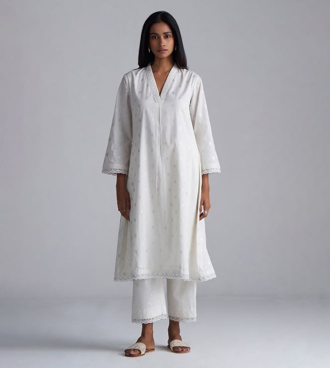 Off-White Cotton Printed Kurta and Pants Set