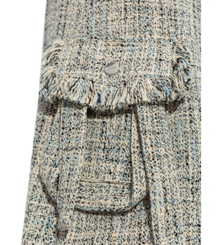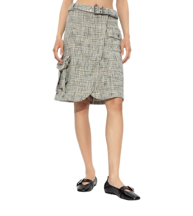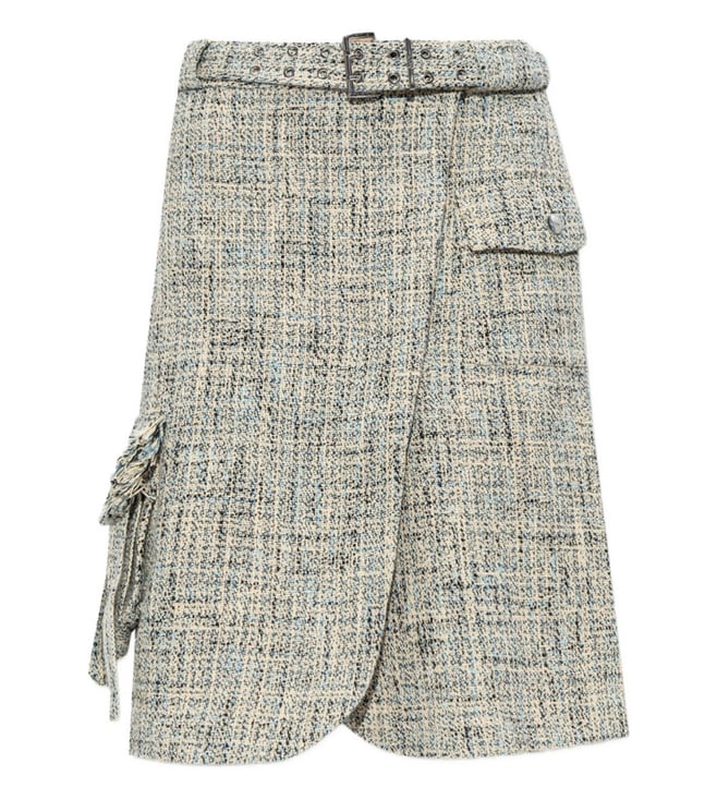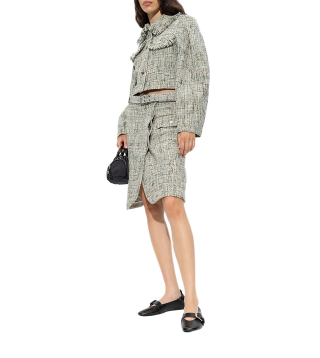 Elevate your wardrobe with the Ganni Beige Checked skirt. Designed with this light beige tweed piece features a timeless wrap design with a belted waist that cinches for a flattering silhouette. flap pockets add a classic touch, while the knee-length cut offers a refined, versatile look perfect for both day and evening wear. these trousers combine comfort and sophistication for everyday wear.