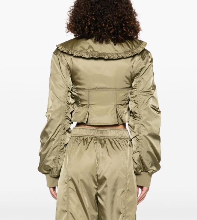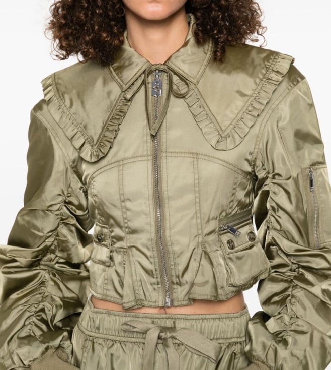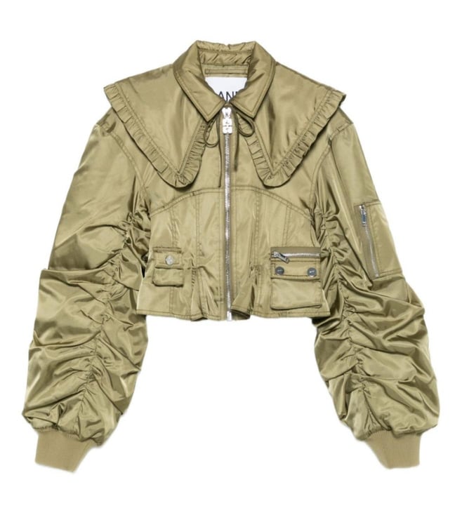 The Ganni Green Jacket is a vibrant fusion of style and sustainability, crafted for the modern trendsetter. Its lush, emerald hue captures the essence of nature, while the sleek, tailored silhouette offers a flattering fit. Made from eco-friendly materials, this jacket features innovative design elements like oversized pockets and a chic, adjustable belt. Perfect for any season, it effortlessly transitions from city streets to countryside escapes, embodying a bold statement of conscious fashion.