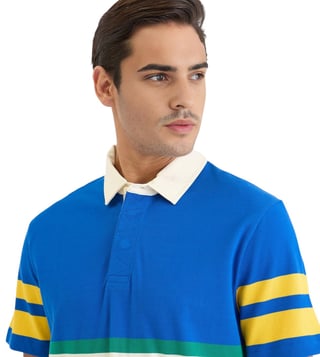 Dive into effortless style with our blue color-block polo t-shirt, designed for the modern man. This regular fit masterpiece features a striking blend of shades, creating a dynamic visual appeal. Crafted from 100% premium cotton, it promises unparalleled comfort and breathability. The classic polo collar and short sleeves add a touch of timeless elegance, while the secure closure ensures a perfect fit. Elevate your wardrobe with this versatile piece, perfect for any casual or semi-formal occasion.