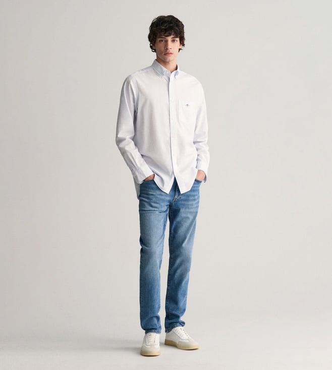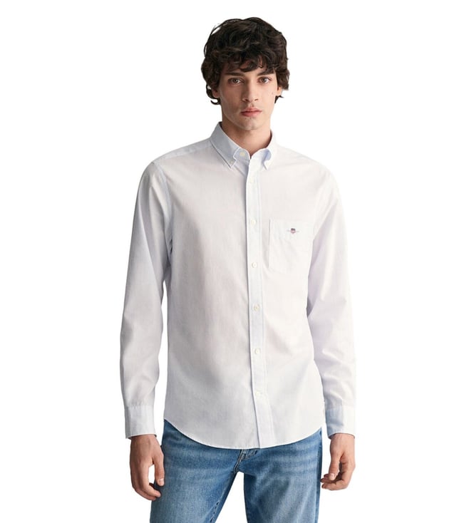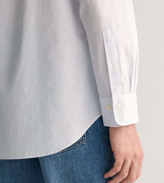 Discover timeless style with our classic poplin banker shirt in a sophisticated blue hue. Designed for the modern man, this shirt features a regular fit that offers comfort and elegance. The subtle striped pattern adds a touch of refinement, making it perfect for both business and casual settings. Crafted from pure cotton fabric, it ensures breathability and softness throughout the day. The full sleeves and button-down collar provide a polished look, while the button closure ensures a secure fit. Elevate your wardrobe with this versatile essential.