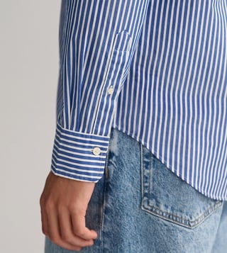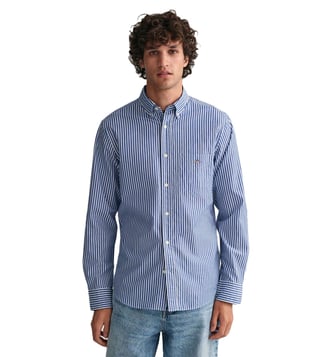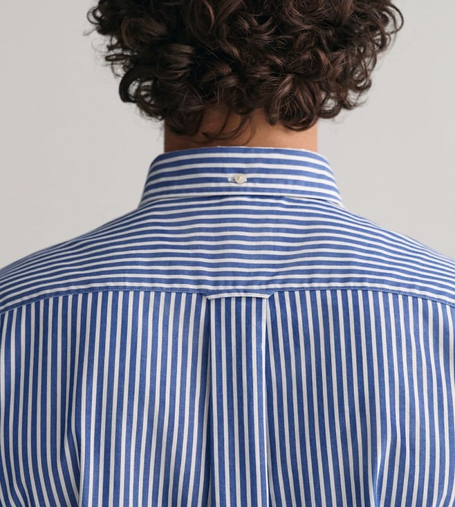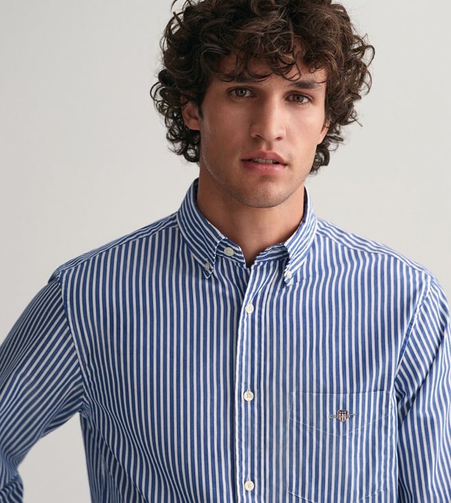 Discover timeless style with our classic poplin shirt in a sophisticated blue hue. Designed for the modern man, this shirt features a regular fit that offers comfort and a polished look. The elegant striped pattern adds a touch of refinement, making it perfect for both casual and formal occasions. Crafted from pure cotton fabric, it ensures breathability and softness. The full sleeves and button-down collar provide a versatile and classic appeal, while the button closure ensures a secure fit. Elevate your wardrobe with this essential piece.