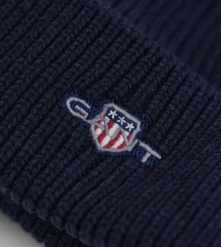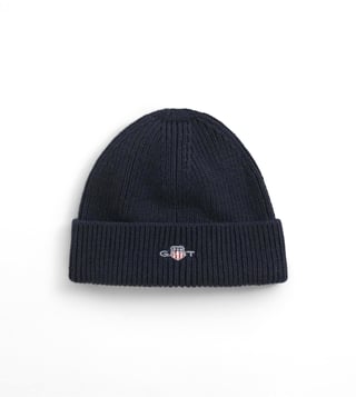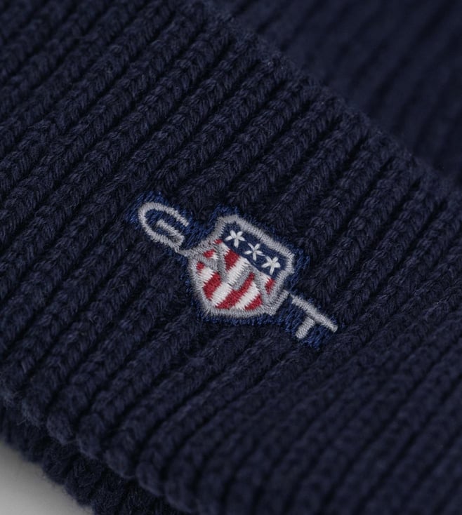 Evening blue shade sets a neat base for this solid beanie styled with a small archive shield at the front. Cotton polyamide wool fabric blend gives warmth without bulk and keeps it comfortable for daily wear. A simple winter accessory that stays in trend while offering a clean finish to casual outfits.