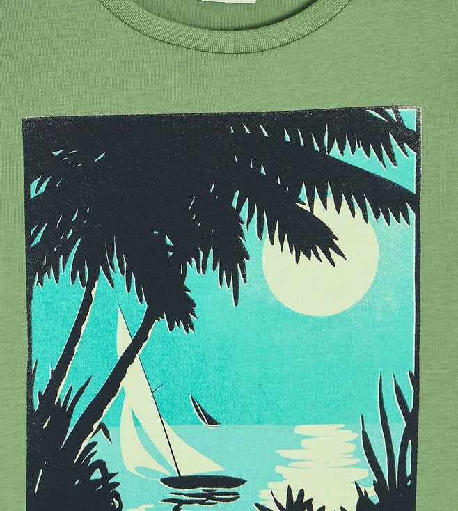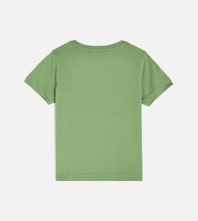Cool and comfy, this green tee is a boy's best friend. Made from soft, breathable cotton, it features a fun printed pattern and a classic round neck. The regular fit ensures all-day comfort, while the short sleeves keep him cool. Pull it on and let the adventures begin!