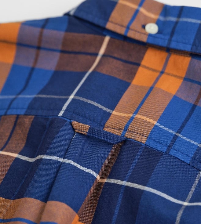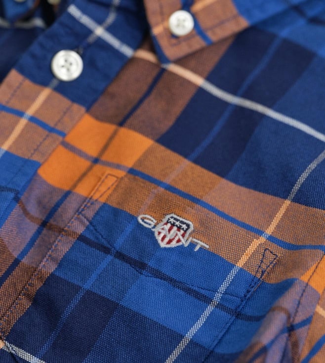 Checkout this trendy Oxford shirt by GANT. Exhibiting a vibrant mix of orange and other hues, it is highlighted with a check pattern. While the button-down collar elevates its fashion appeal, the logo detailing on the left chest adds more sophistication to it. It will look great with a pair of jeans.