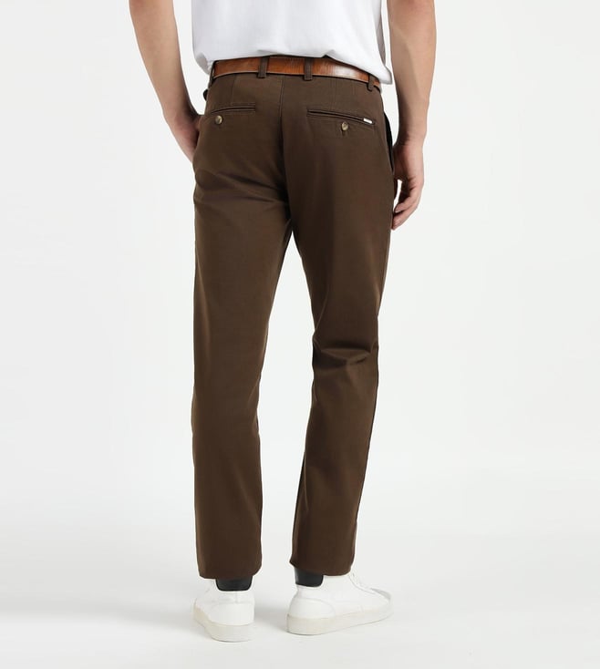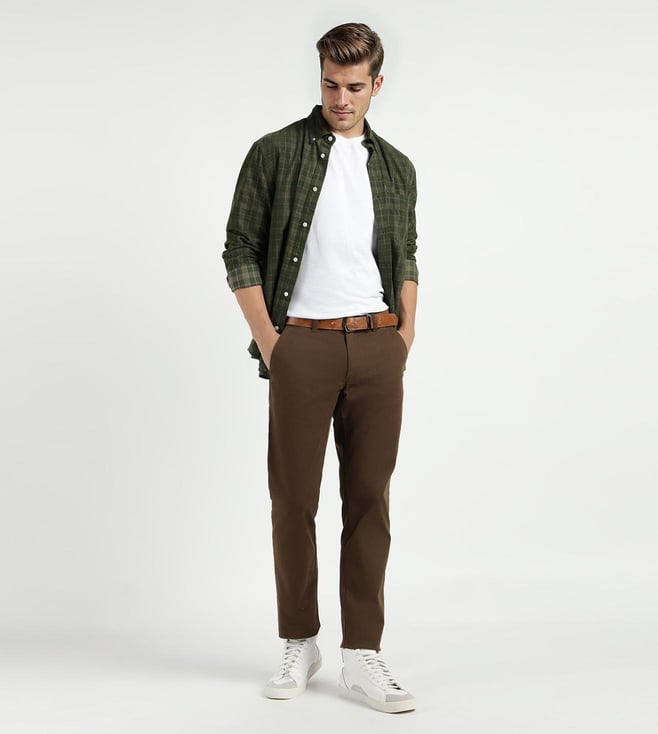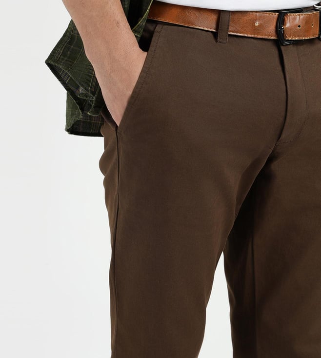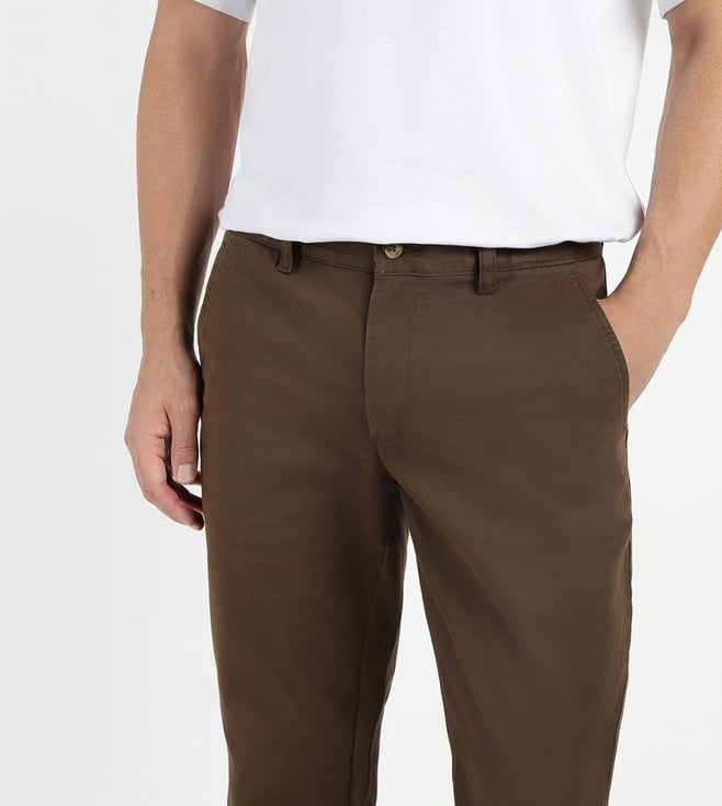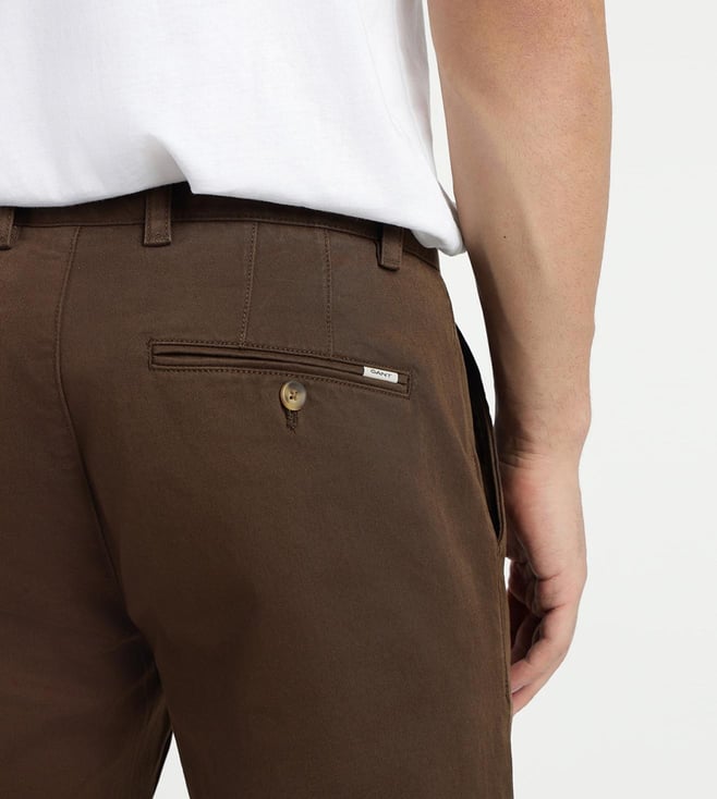 Elevate your everyday style with GANT Men Dark Brown Cotton woven Chinos Trouser. Crafted from high-quality cotton.This slim-fit chinos feature a mid-rise waist and a solid button closure for a sleek, tailored look. Versatile and comfortable.This trousers are perfect for both casual and semi-formal occasions. Whether you are dressing up for work or a night out.This chinos will effortlessly elevate your wardrobe. Stay on-trend and confident with this timeless essential.