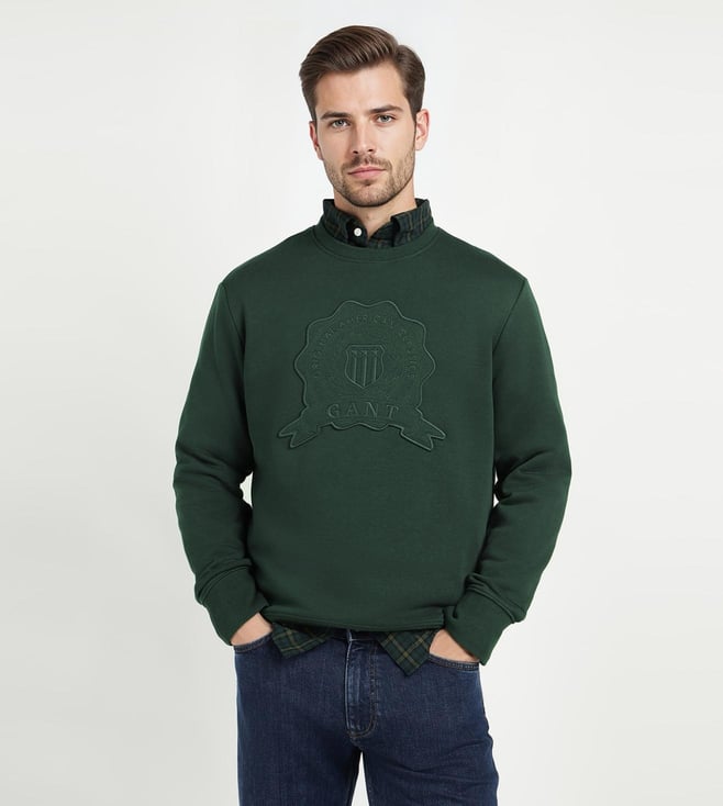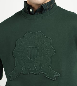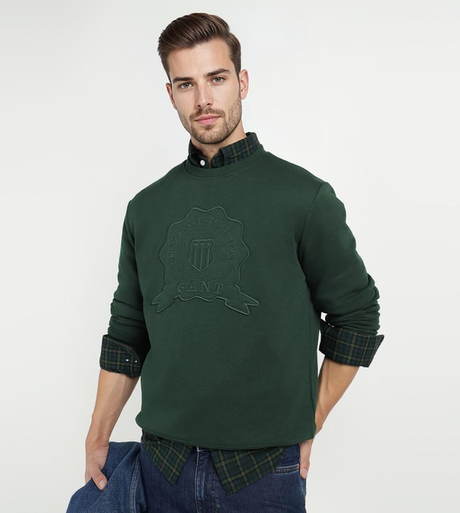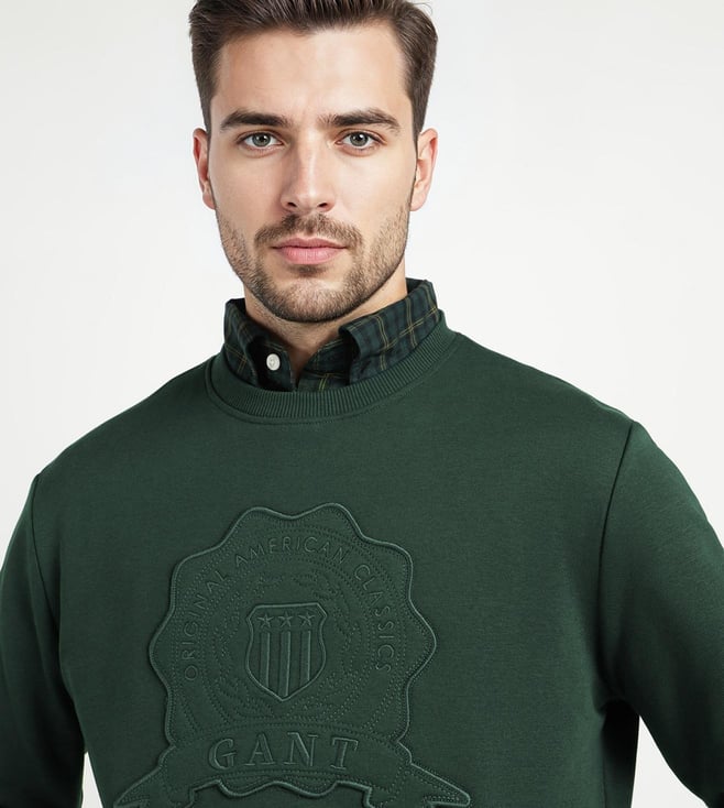 Elevate your casual wardrobe with the GANT Men Dark Green blended knitted Sweatshirt. Crafted with comfort in mind. This regular fit pullover features embroidered details on the crew neck and long sleeves for a touch of sophistication. The dark green hue adds a versatile pop of color to any outfit, while the blended knit fabric ensures both warmth and breathability. Whether you are lounging at home or out running errands. This sweatshirt effortlessly combines style and comfort for the modern man on the go.