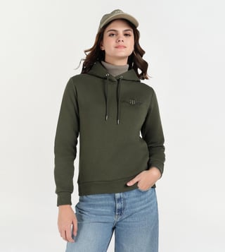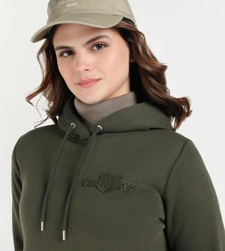 This versatile piece features a classic long sleeves pull over design with a regular fit, perfect for everyday wear. The dark olive color adds a touch of sophistication, while the iconic GANT logo on the front adds a trendy flair. Crafted from a high-quality blend of materials. This hoodie is soft to the touch and comfortable to wear all day long. Whether you are running errands or relaxing at home. This hoodie is sure to keep you looking chic and feeling great. Elevate your casual wardrobe with this must-have piece.