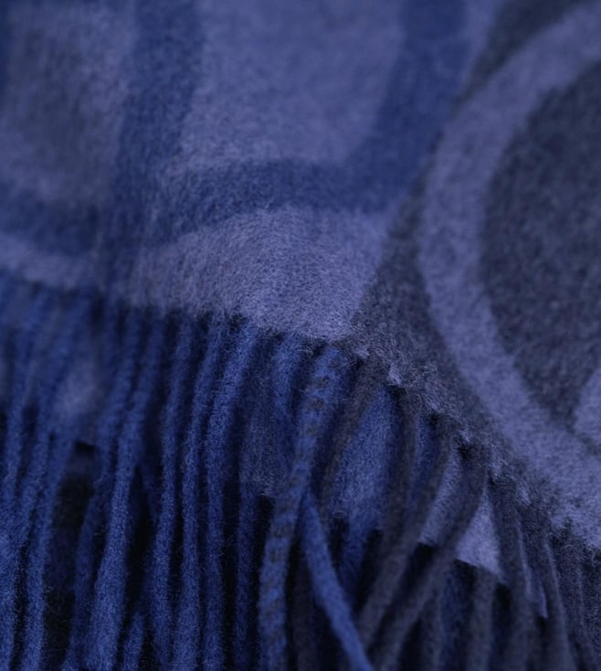 Evening blue tone sets a calm base for this scarf made of pure merino wool fabric. Jacquard weave with monogram detail keeps it aligned with the trend. Fringed edges bring movement while the stretchable quality lets you adjust the wrap easily. Works as a light yet warm layer for both everyday looks and evening outings.