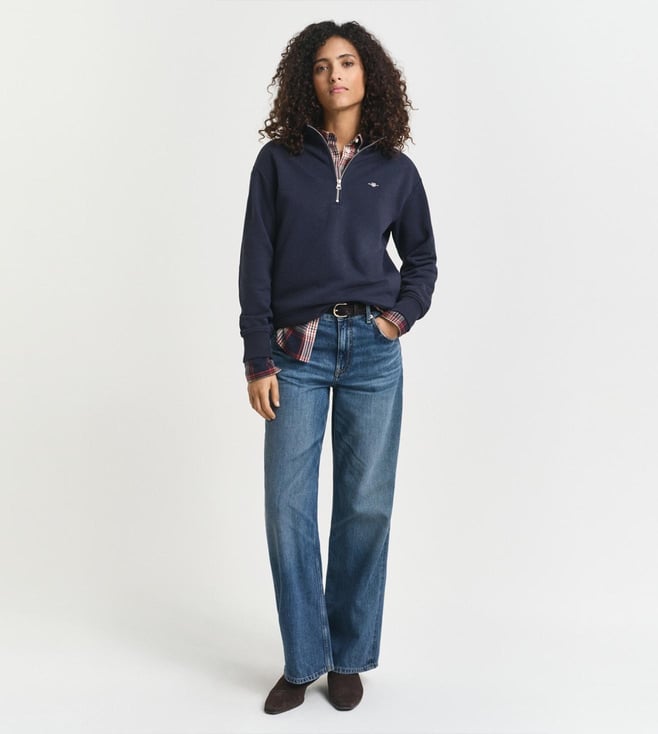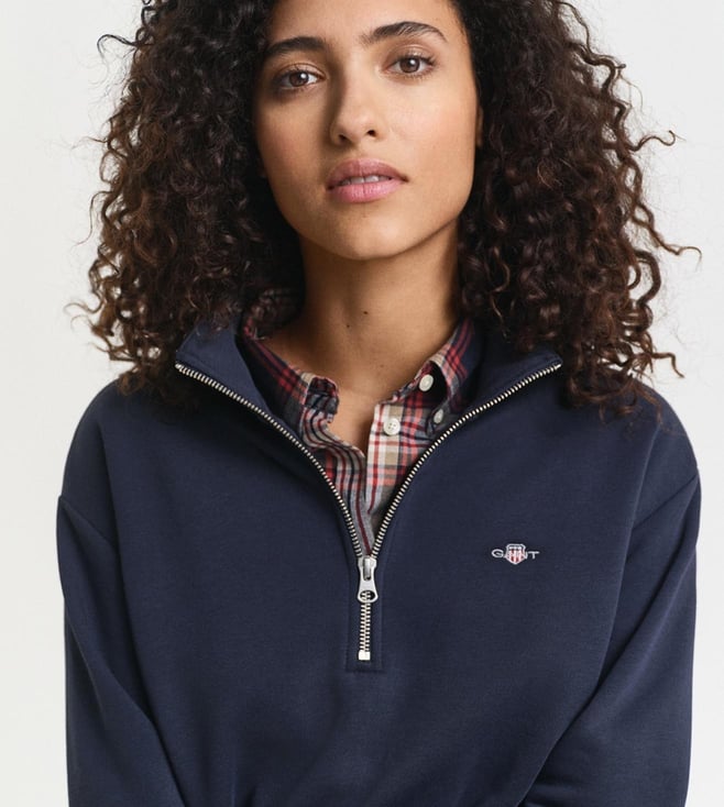 Made from cotton and recycled polyester fabric this women sweatshirt is stretchable and ribbed for comfort. Designed in evening blue with stand collar and half zip closure. Full sleeves add warmth. The solid pattern keeps it classic. Works well for regular wear and can be styled simply with trousers or jeans