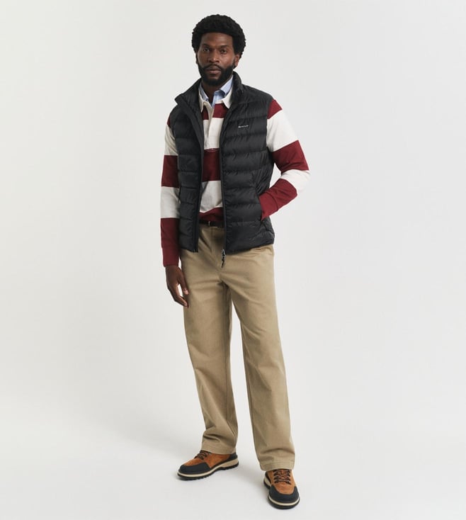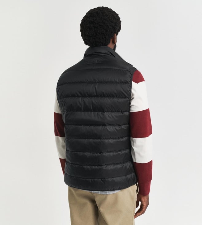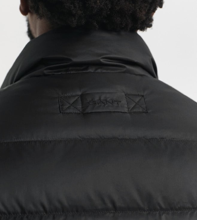 Layering gets simple with this light down vest in recycled polyester fabric. The solid black tone keeps it versatile while the cut sleeve design adds a sharp edge. Collar detail and two front pockets bring function along with style. A clean minimal piece built for comfort in everyday layering.