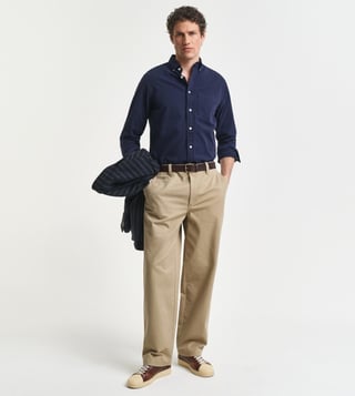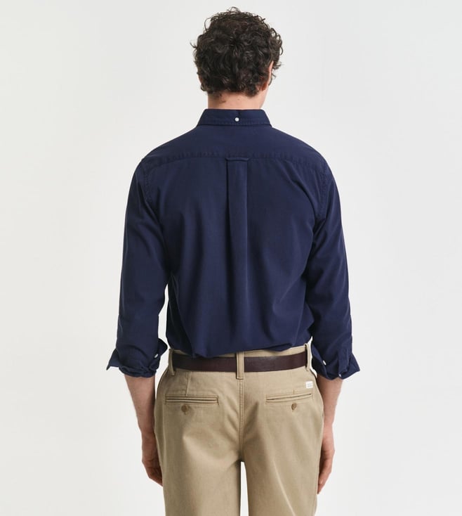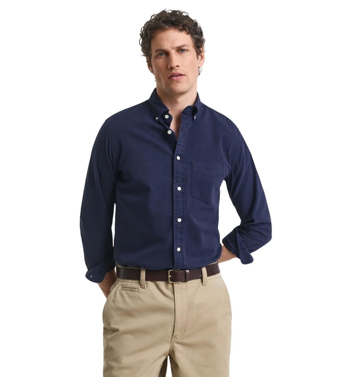 Unleash your dapper-guy look with this blue shirt from GANT. It features a solid design with a button-down collar and back pleats. For ease of hanging, it is detailed with a back loop. To make a mark in the fashion circuit, team this shirt with a pair of flat-front chinos and sneakers.