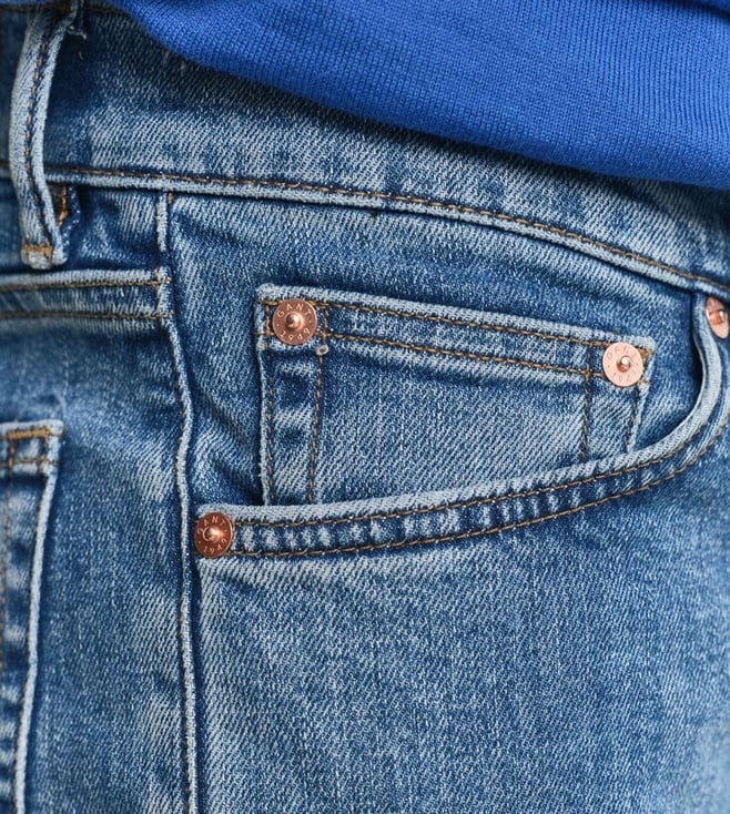 Mid blue worn-in shade gives these jeans a natural lived look that stays in trend. Designed with four pockets and a clean wash finish they keep style simple yet polished. Made with cotton polyester and elastane fabric blend they offer comfort with a slight stretch. Easy to pair with shirts or tees for daily wear.