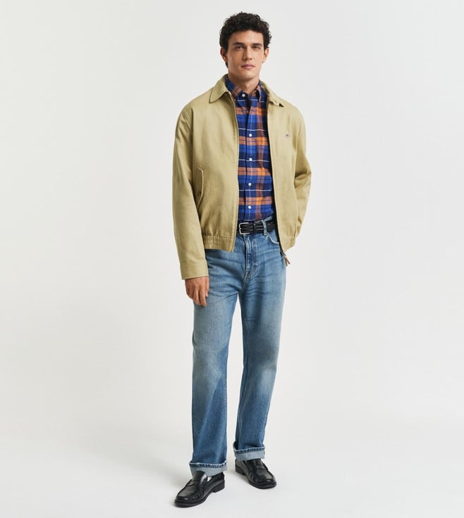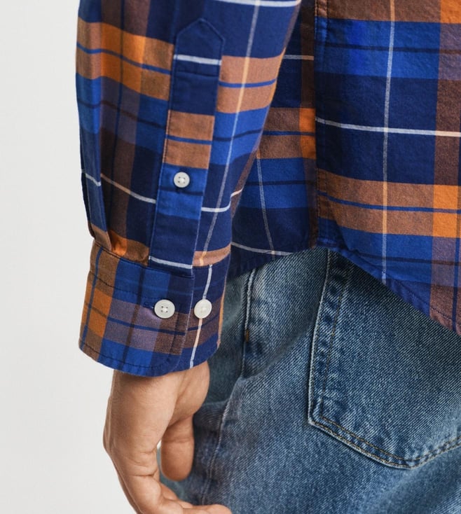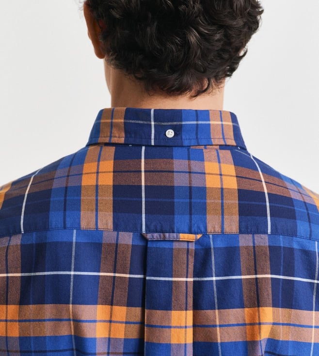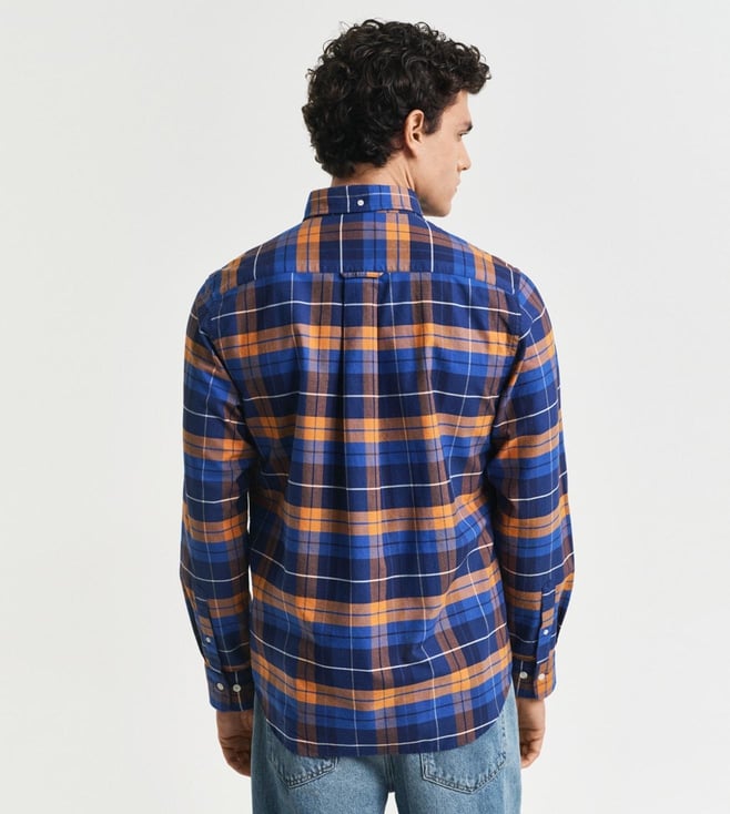 Exhibiting a striking mix of orange and blue, this Oxford shirt by GANT is a perfect staple for streetwear styling. Highlighted with a cool check pattern, it features a button-down collar and back pleat styling for an edgy look. Team it with a pair of blue jeans and moccasins to make a mark in the fashion circuit.