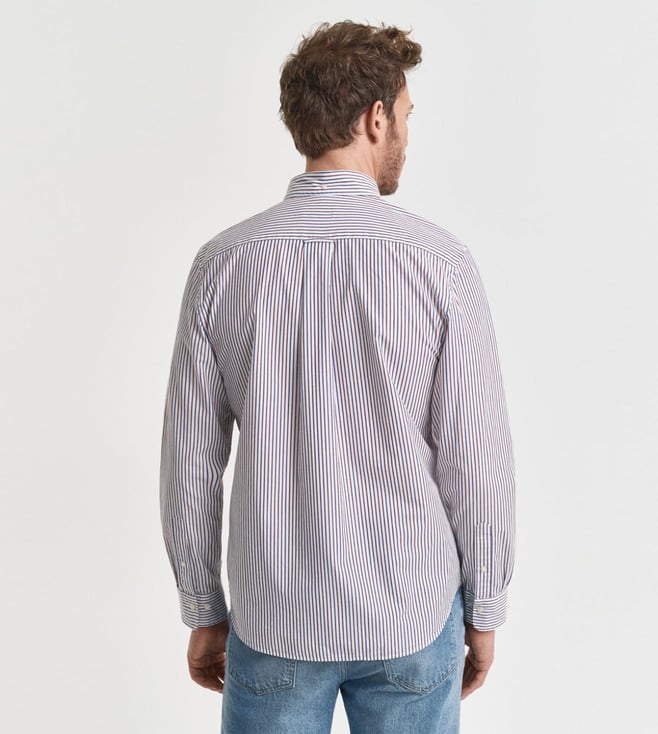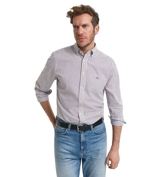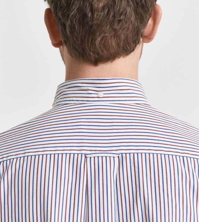 Exhibiting a charming interplay of red, white and blue, this GANT shirt looks extremely classy. Perfectly tailored with a button-down collar and back pleats, it is highlighted with vertical stripes for added sophistication. Team it with jeans or chinos to make a mark in the fashion circuit.