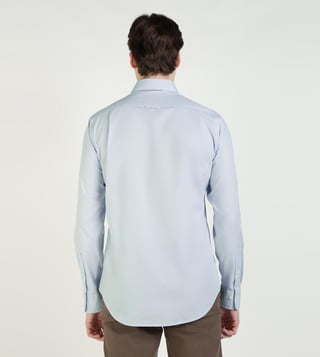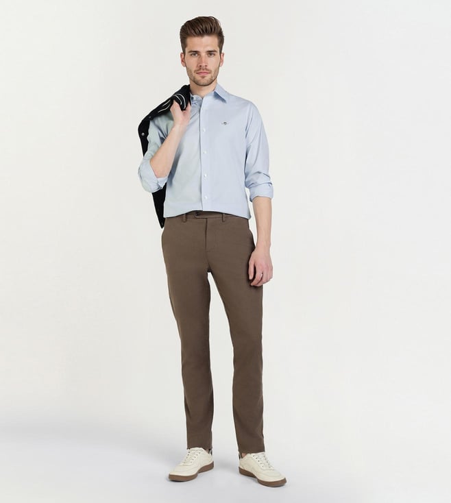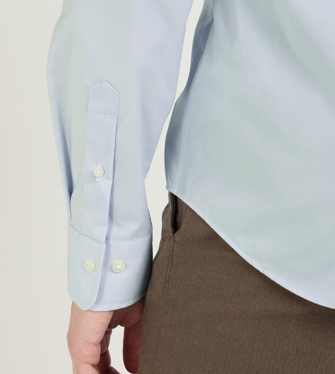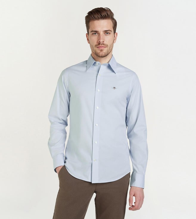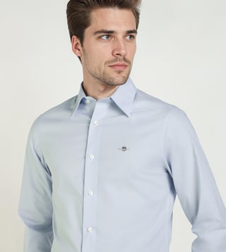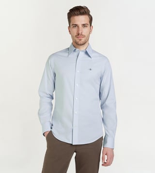 Elevate your wardrobe with GANT Men Light Blue Cotton woven regular solid shirt. Crafted with precision. This shirt features a sophisticated solid design with a sleek slim fit, perfect for a polished look. The comfortable cotton fabric ensures all-day wearability, while the classic button-down style and shirt collar add a touch of timeless elegance. Whether you are dressing up for a special occasion or adding a refined touch to your everyday attire.